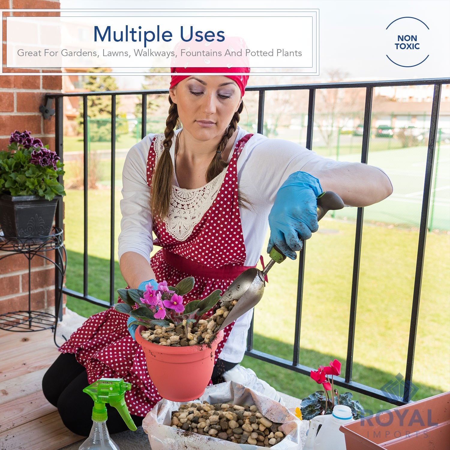 - NATURAL STONES- These high quality natural stones by Royal imports are non-toxic and eco-friendly river rocks. Their natural attribute will make them last longer because they will not deteriorate like mulch does. Common applications include flowerbeds, groundcover, decorative concrete topping, or walkway paving. Decorative rocks are a permanent and cost-effective alternative to annual wood mulching.