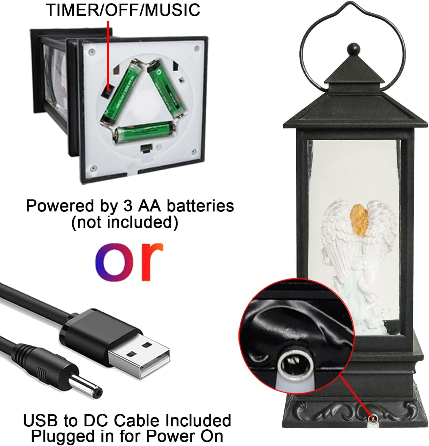 - ★POWER SUPPLY: Included USB to DC cable allows you operate the snow globe lantern without batteries. You can also operate it with 3 AA batteries, so that you can place them any where you want.