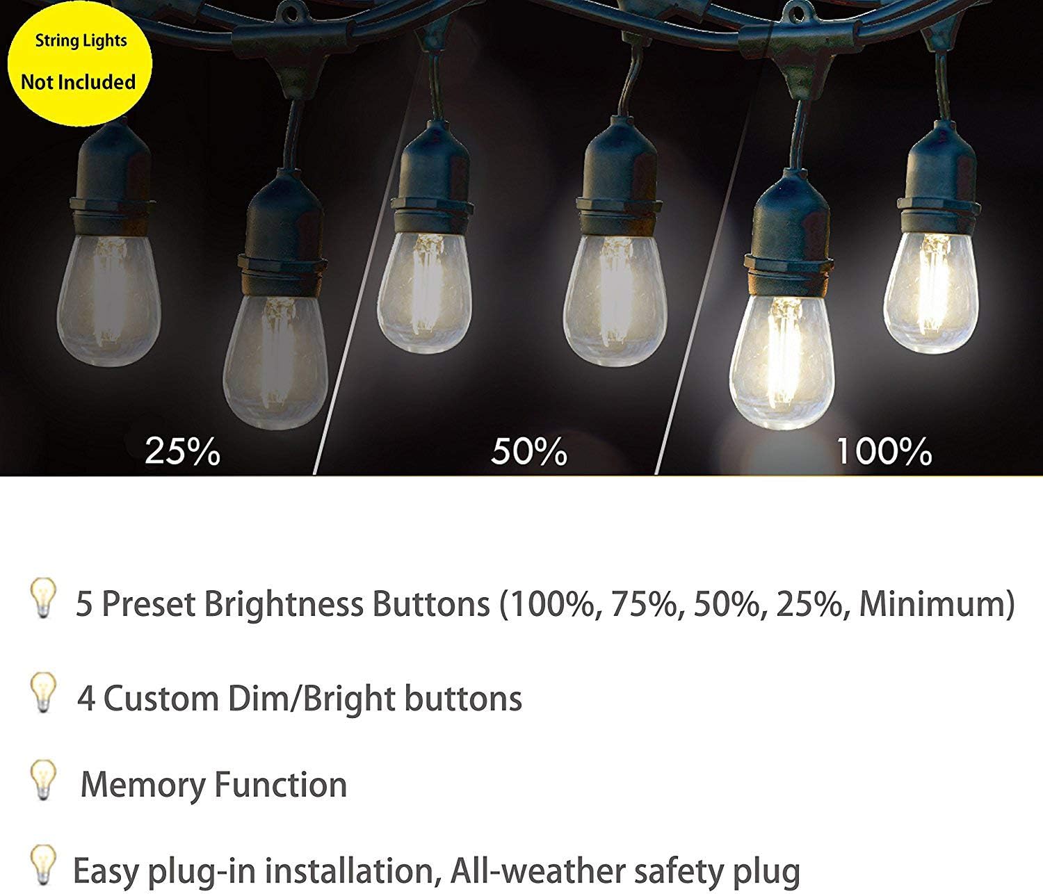 Max Power 200W Waterproof Outdoor String Lights Wireless Remote Control, 150Feet Range, Memory, Stepless Dimming, IP68 Waterproof. UL 3 Prong Remote Control Dimmer