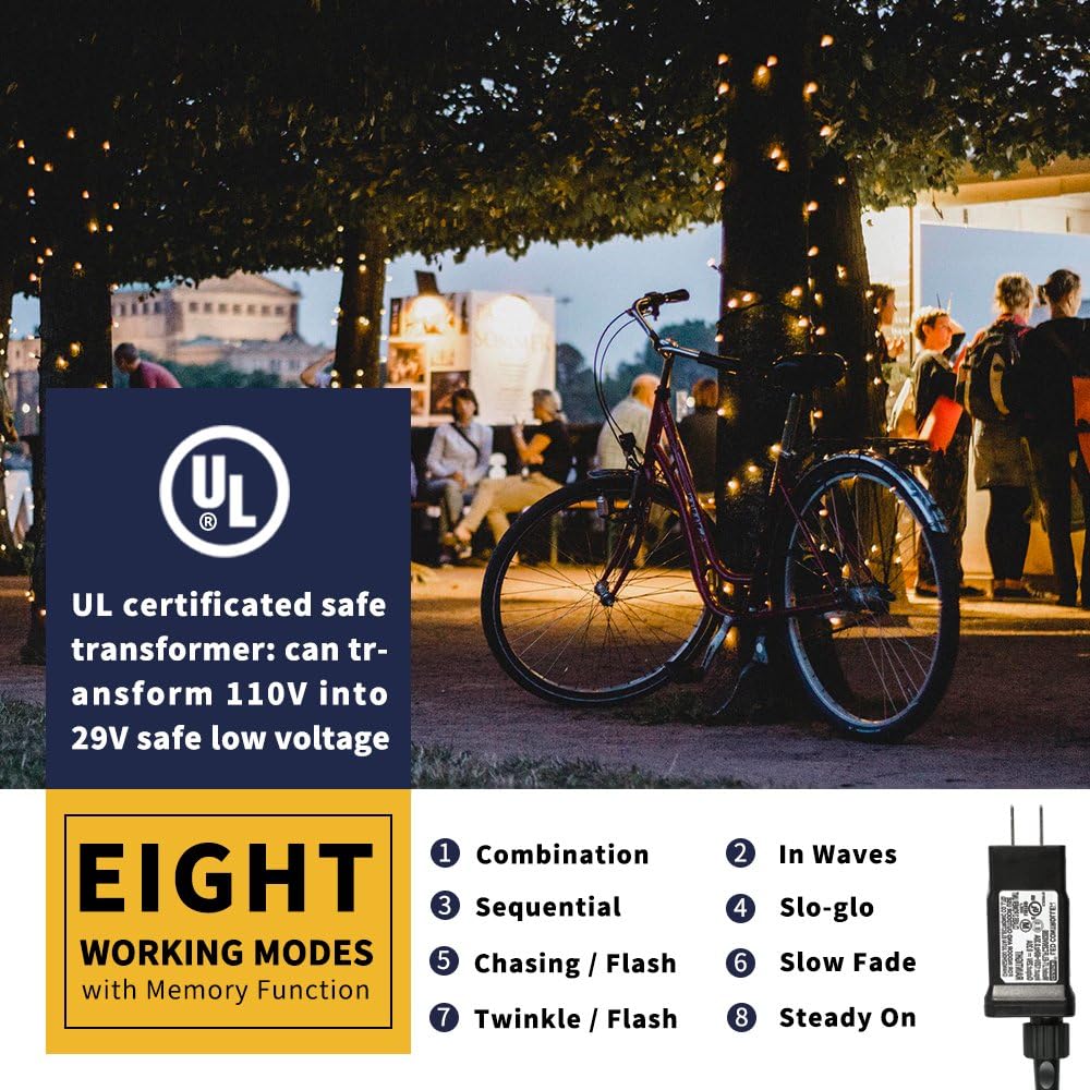 - 29V Low Voltage and UL Certified, Safe to Use:New generation 29V low voltage transformer and whole set string lights including string wire, LED bulbs and plug have been certified by UL to ensure & maximize the safety. Meets UL588 standard for safety of Holiday/seasonal decorative light, much safe to use. Perfect for Christmas, halloween, Easter, weddings, party, festival, holiday decoration.