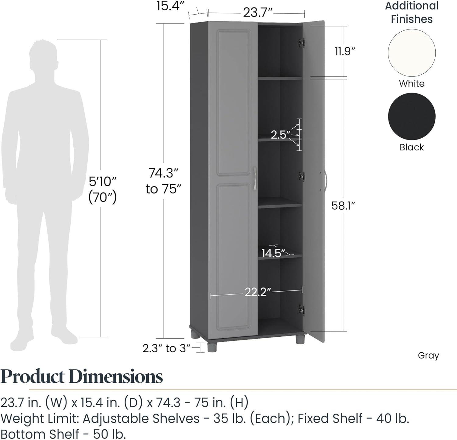 - Product Dimensions : 15.38"D x 23.69"W x 75"H