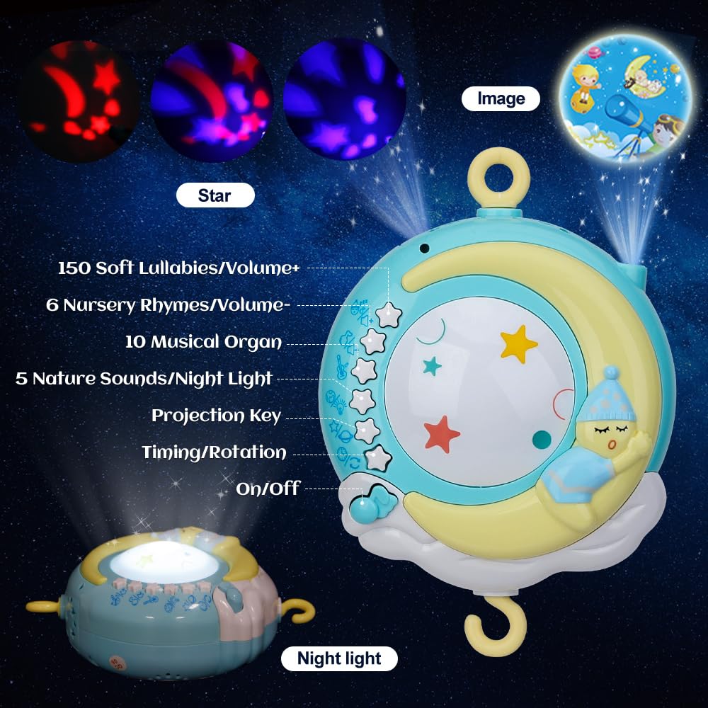 Baby Musical Crib Mobile with Timing Function Projector Lights,Stand-Along Rattles and 150 Melodies Music Box with Remote Control for Newborn 0-24 Months