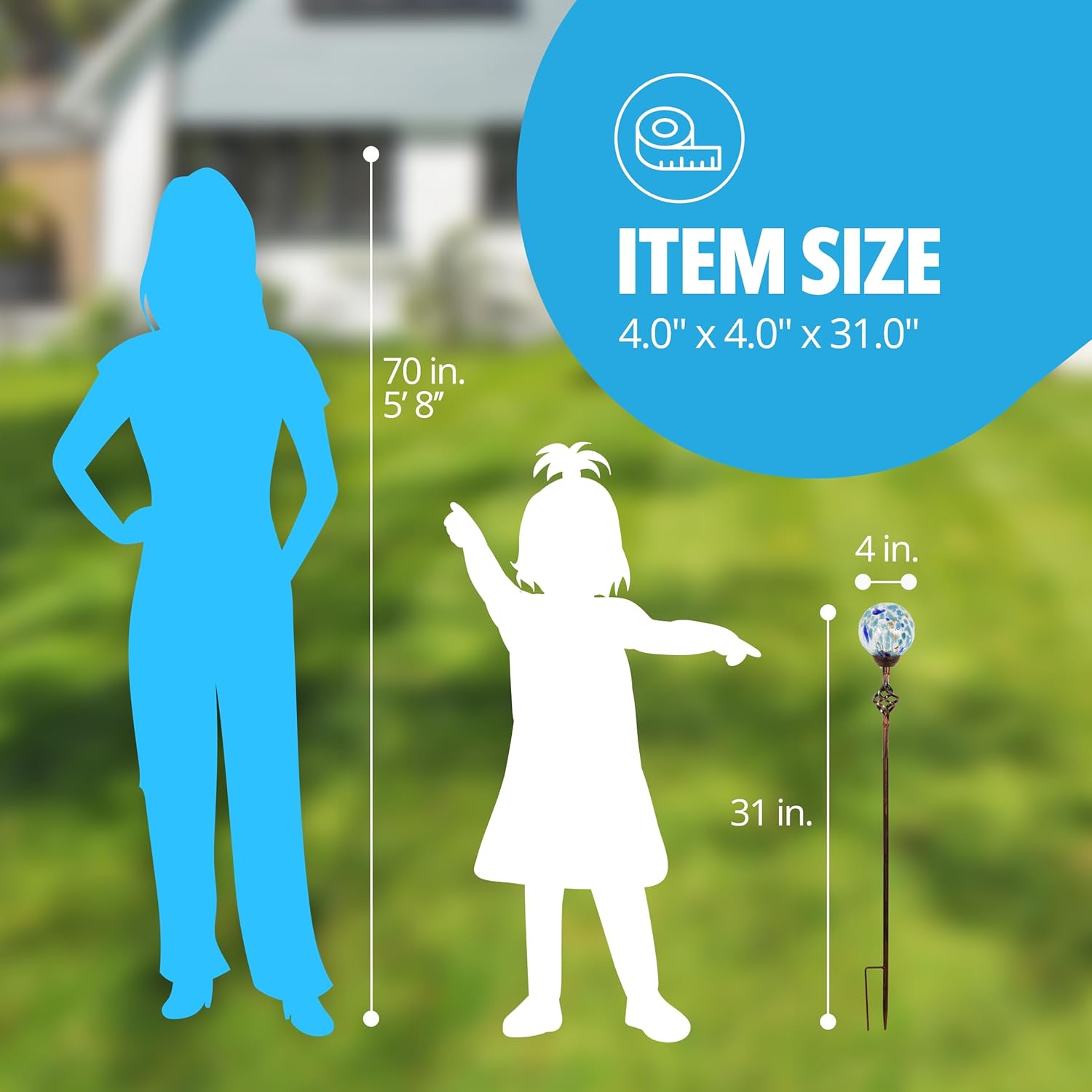 Exhart Garden Solar Lights, Decorative LED Honeycomb Glass Ball Garden Stake, Glass and Metal Outdoor Decoration, Blue, 4 x 31 Inch