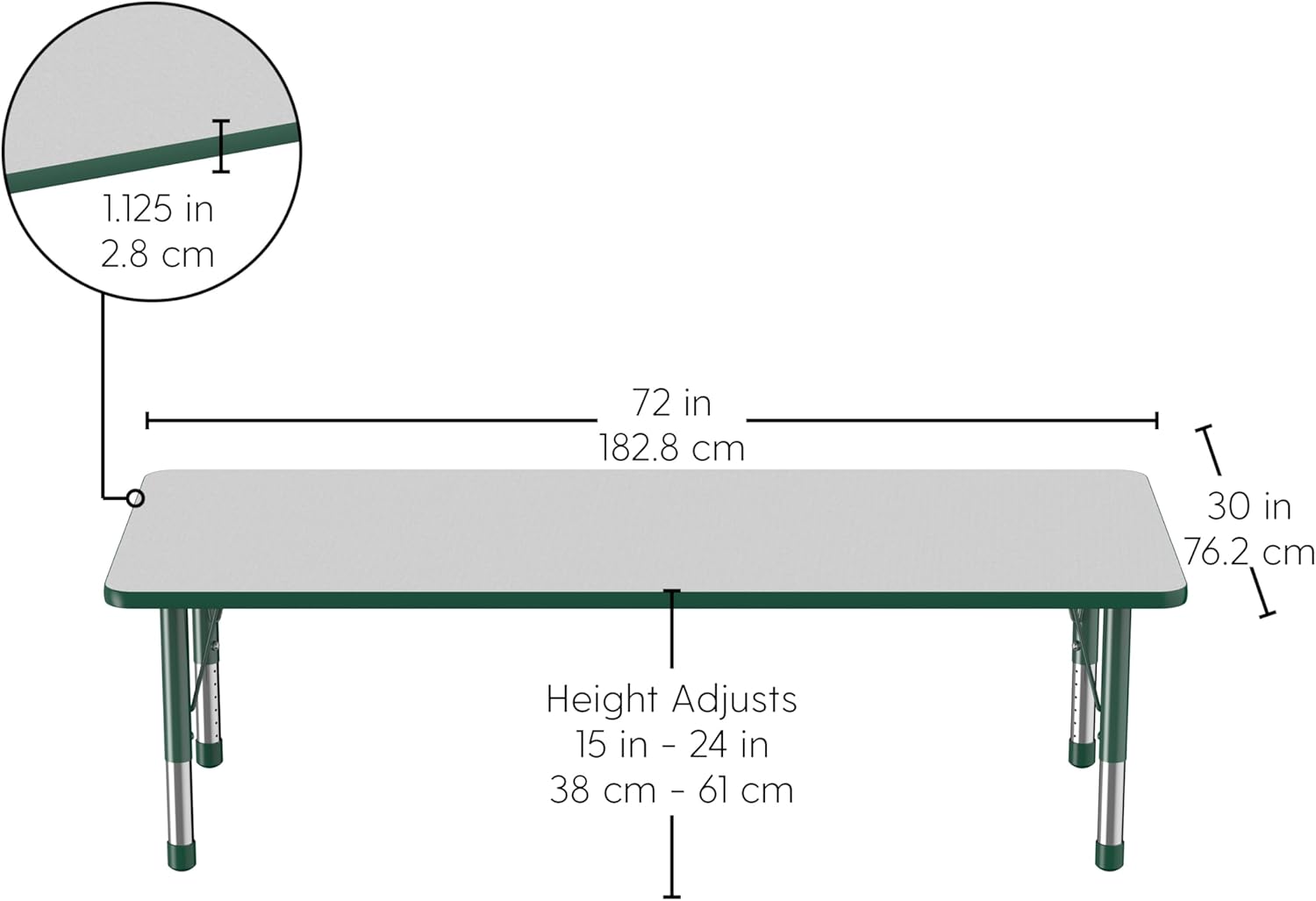 FDP Rectangle Activity School and Classroom Kids Table (30 x 72 inch), Chunky Toddler Leg, Adjustable Height 15-24 inches - Gray Top and Green Edge