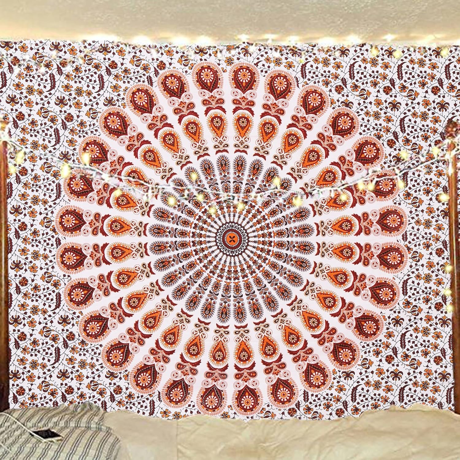 Bless International Handmade Indian hippie Bohemian Psychedelic Peacock Mandala Wall hanging College Dorm Beach Throws Table Cloth Bedding Tapestry (Orange Brown, Twin(54x72Inches)(140x185cms))