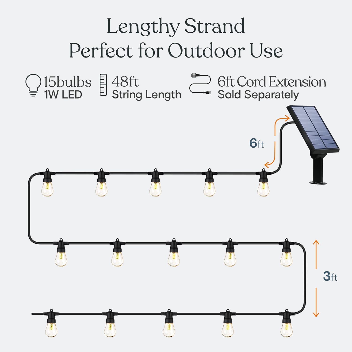Brightech Ambience Pro Solar Powered Outdoor String Lights, 48 ft Commercial Grade Waterproof Patio Lights, 15 Edison Bulbs, Shatterproof LED String Lights for Outside, Porch - 1W Soft White
