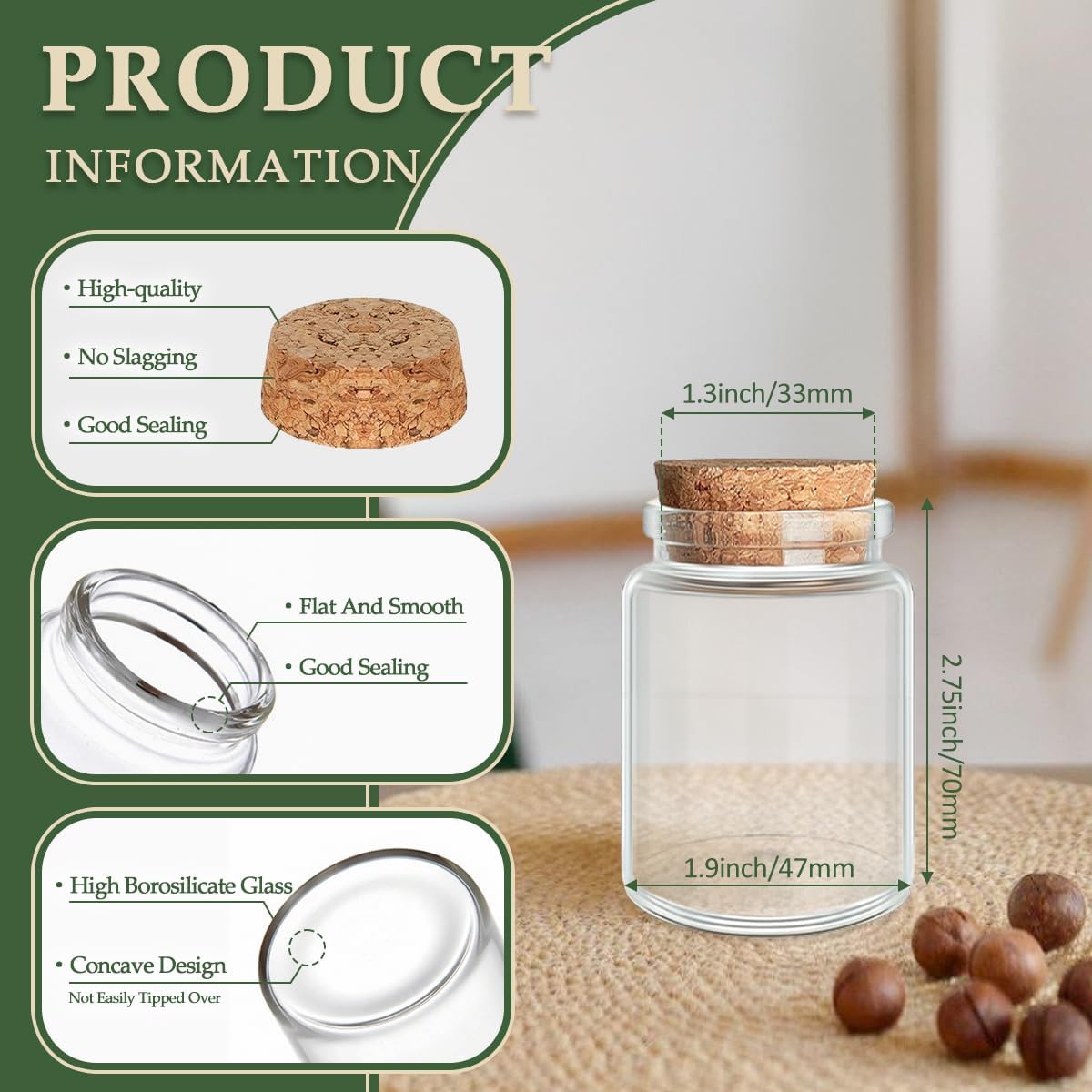 - Bottle mouth diameter: 1.3 inch (33 mm);bottle height (Without Cork): 2.75 inch (70 mm);bottom diameter: 1.85 inch (47 mm)
