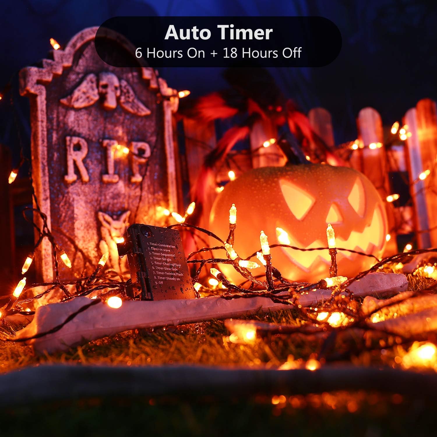 - 8 Modes & Auto Timer: These orange halloween string lights have 8 gorgeous lighting modes with built-in auto-timer 6 hours "ON" and 18 hours "OFF", which starts once you activate any one of the 8 modes on the battery holder, so it will automatically time when the light is on. Note: If you change modes before the timer expires then it will stay on that mode for another 6 hours.