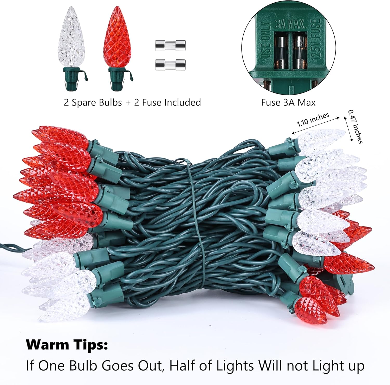 Brizled Red & White C5 Christmas Lights, 33ft 100 LED Christmas tree Lights, Connectable 120V UL Certified Faceted Christmas Lights Outdoor Indoor Xmas Lights for Christmas Tree Party Roof Decoration