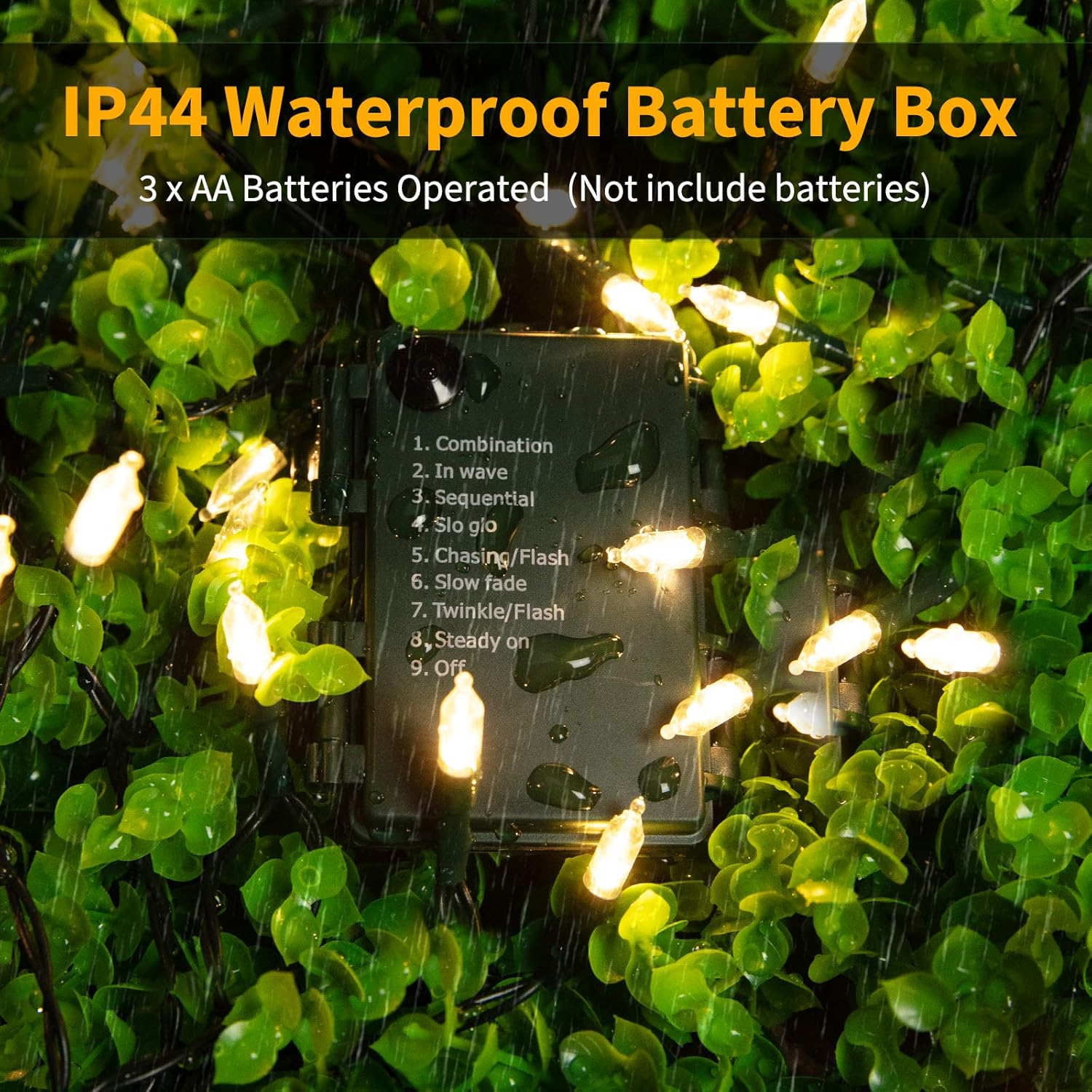 - Manual operation: There is 8 various fantastic lighting effects adapting to desired occasions or events: press the button on control box repeatedly to select 1.combination, 2.in wave, 3.sequential, 4.slow glow, 5.chasing or flash, 6.slow fade, 7.twinkle or flash or 8.steady on
