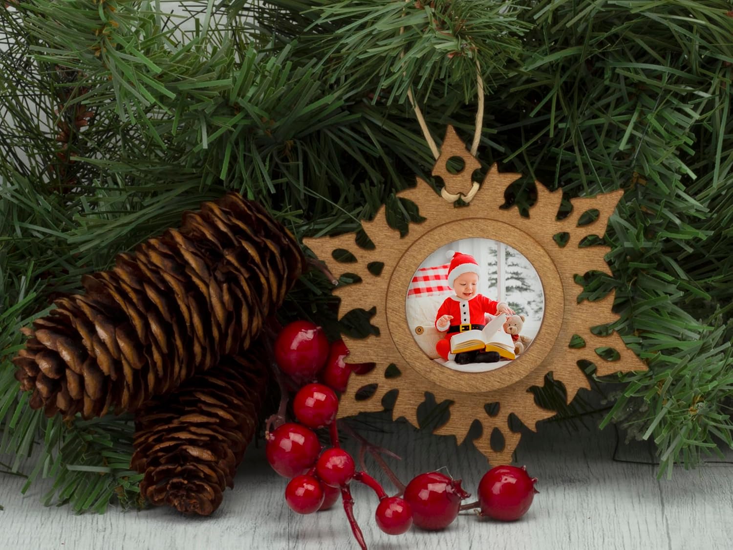 - These photo ornaments are laser cut, and made out of a dark wood shaped like a snowflake. Perfect gift for those looking for a farmhouse, rustic or natural decor