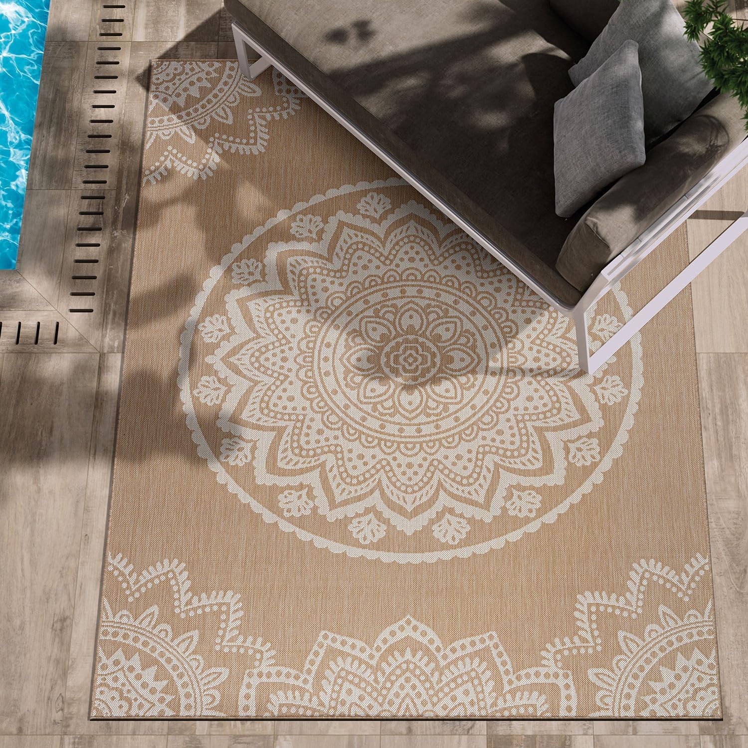 CAMILSON Outdoor Rug 8x10 Modern Area Rugs for Indoor and Outdoor Patios and Porches - Waterproof, Washable, Non-Shedding, Easy-to-Clean Outside Carpet (8 x 10, Medallion - Beige/White)