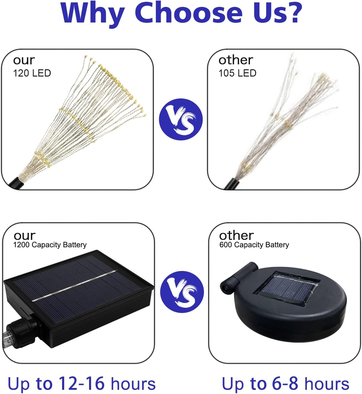 - [Continuous Lighting For 12~16h] While most brands use 600 capacity battery, Unihoh solar garden fireworks lights are equipped with 1200 ultra-large capacity rechargeable battery, which is able to provide 12-16 hours of continuous lighting after 4-6 hours of full charge while others can only work 6-8 hours.