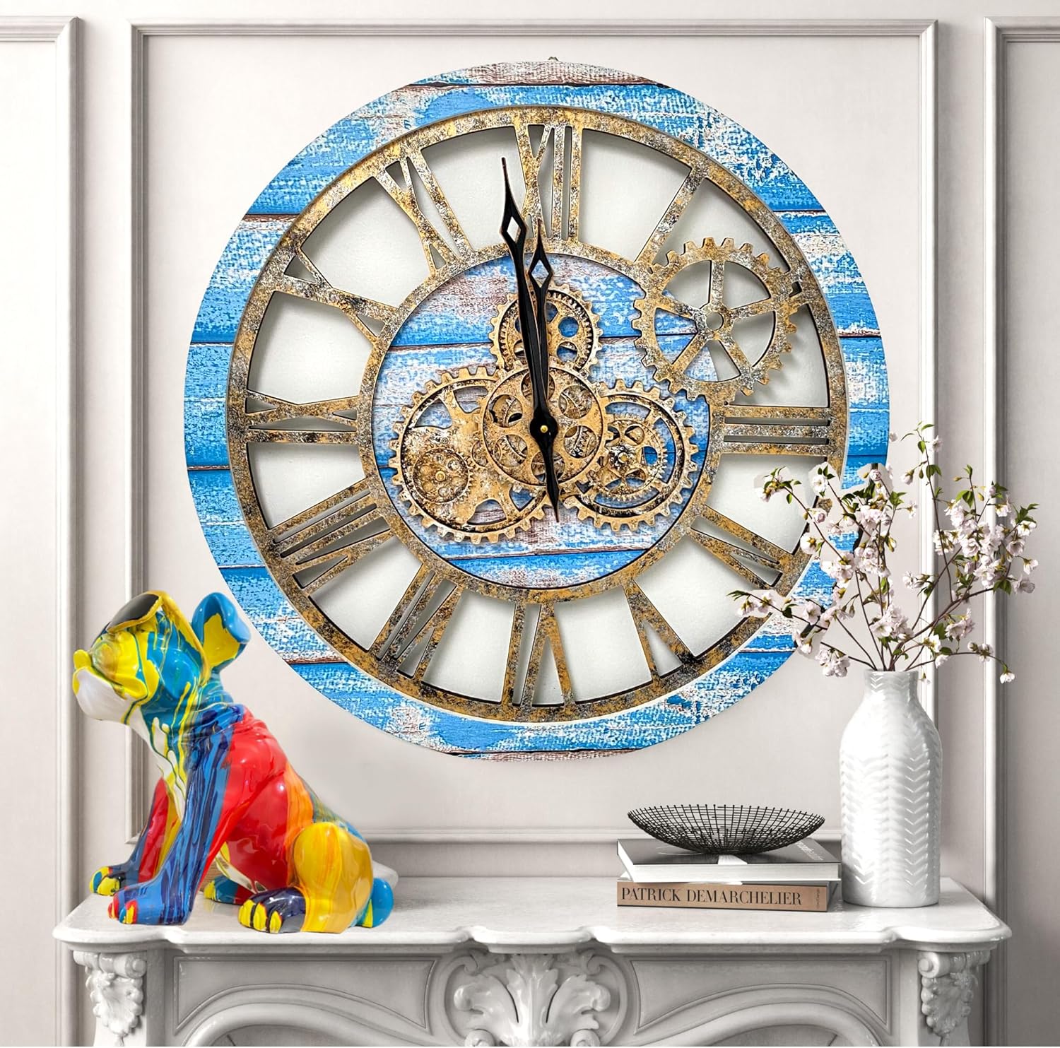 The Gears Clock The Original Real Moving Gear Wall Clock Vintage Industrial Oversized Rustic Farmhouse (24 inch (60cm), Vintage Ocean Blue and Bronze)