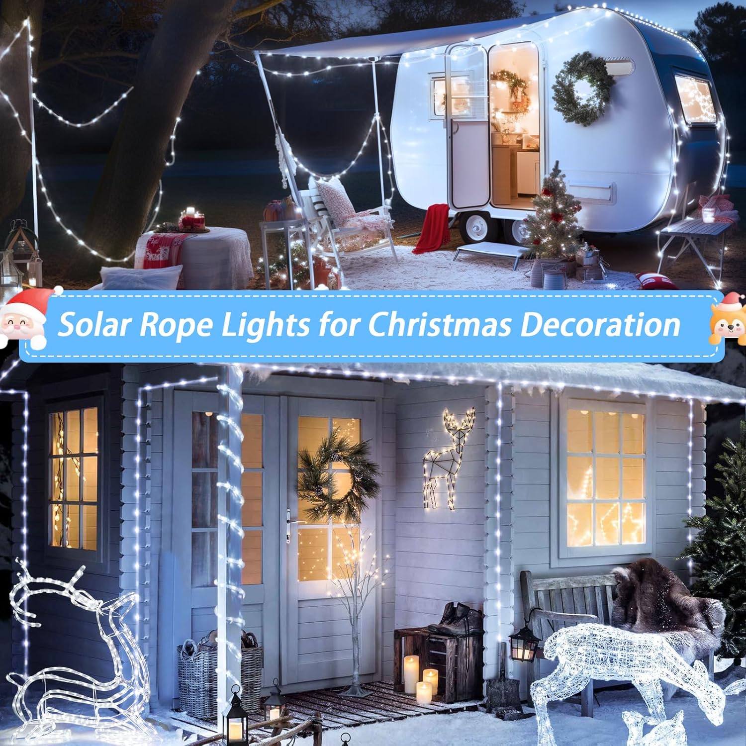 - [SOLAR POWERED AND LONG WORKING TIME] Solar powered rope lights are energy-saving and environmental friendly, providing solar energy, do not require any additional electricity costs and no battery replacement. The light sensor controls the solar rope lights to automatically turn on in the dark and turn off automatically during the day. When the solar panel absorbs enough sunlight, the LED rope light can work for 8 hours or more, give you a night of lighting