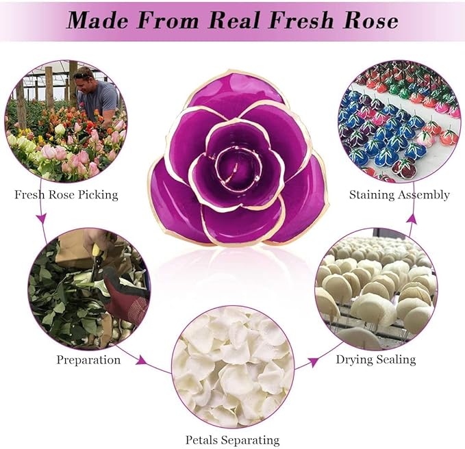 - ♥【Real Rose Handmade 】Handmade makes this gold rose never fade or deform, intricate details of the leaves and delicate petals remain visible, edges and stem are finally dipped in 24K gold, multi-color available