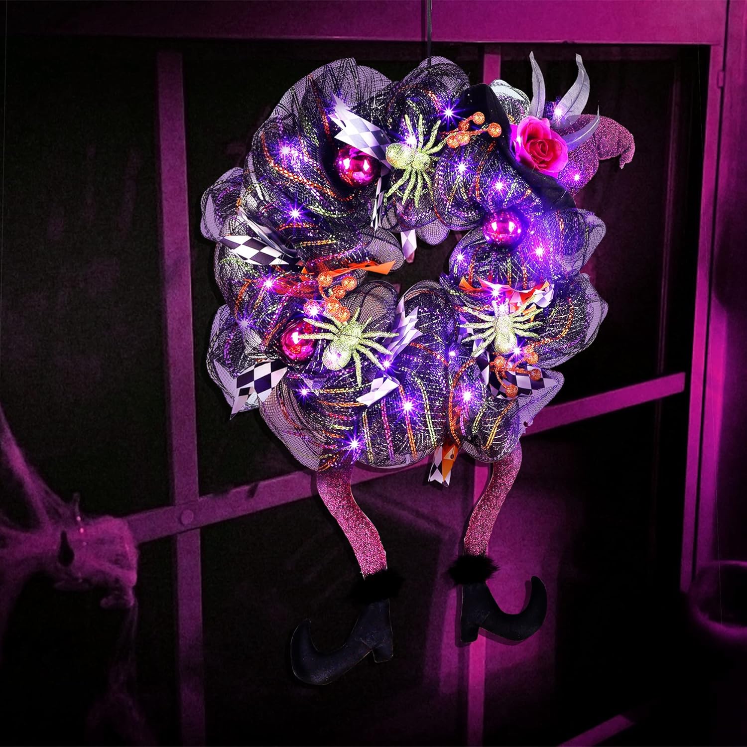- HIDDEN WITCH CHARACTER: Lulu Home wreath creatively adds a witch hat with purple roses in the upper right position, and hangs a pair of witch legs below, very cute and interesting, and full of Halloween atmosphere. Ideal for hanging in front of a door or anywhere else, and it will definitely impress neighbors and passers-by, and get compliment.