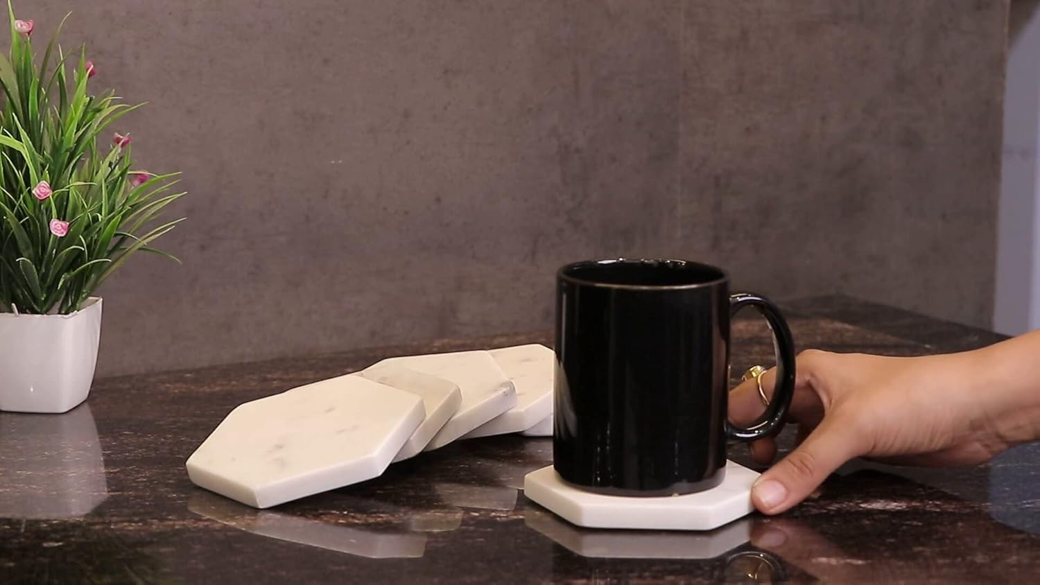 - PROTECT YOUR FURNITURE: Tired of cleaning smudges off your precious furniture, these marble coasters keep the stains/ water rings/ moisture away keeping your dining table or your kitchen countertop clean. Enjoy your favourite drinks, cocktails, margarita on your cherished table or desk as these coasters donโt mess up the table.