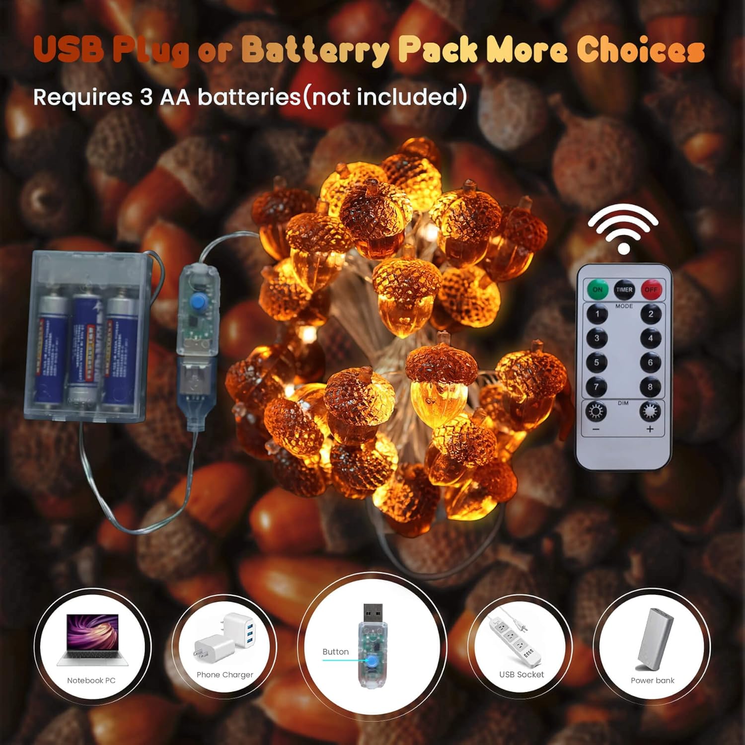 Thanksgiving Acorn Lights Fall Garland Decorative Fairy String Light Cute Novelty Lights 30 LEDs 10 ft USB or Battery Operated for Bedroom Wedding Xmas Harvest Decor