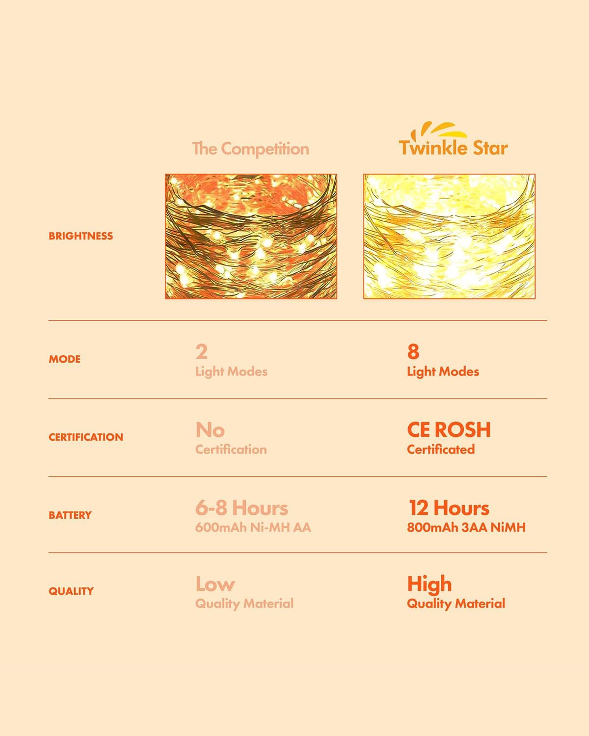 - Solar String Lights Outdoor: Add a soft, festive glow to your Christmas decor with Twinkle Star 2 pack 120 super bright LED solar string lights for outside. Made of thin and flexible wire, easily build the shapes you want, enhancing outdoor lighting in every holiday season. The string lights is 39.4 ft, Long power cord: 6.5 ft, Total Length: 45.9ft.