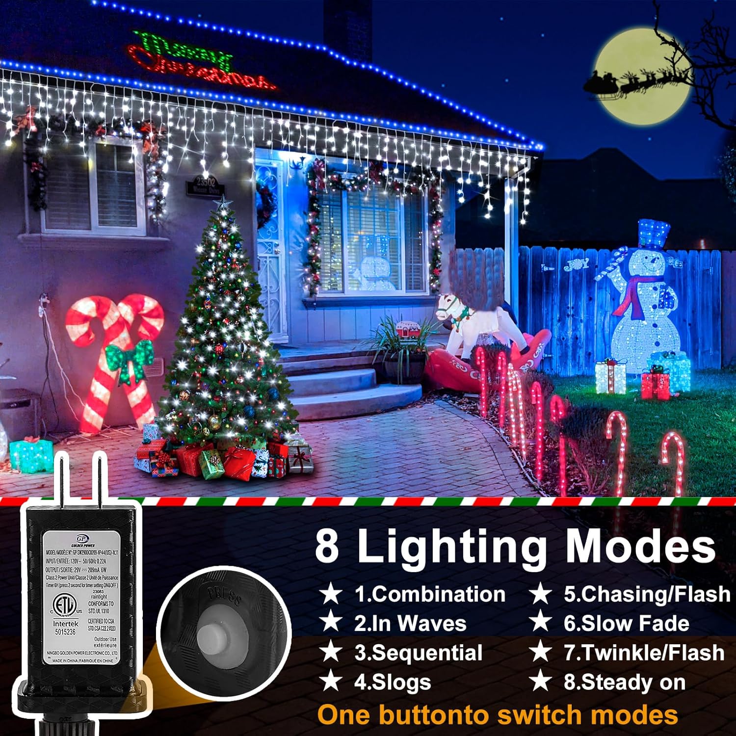 - 8 Lighting Modes Christmas Lights: Christmas lights outdoor modes include Combination, In Waves, Sequential, Slo Glo, Flash, Slow Fade, Twinkle, and Steady On, all controlled by one button. Make your home stand out on the block with our Christmas string lights