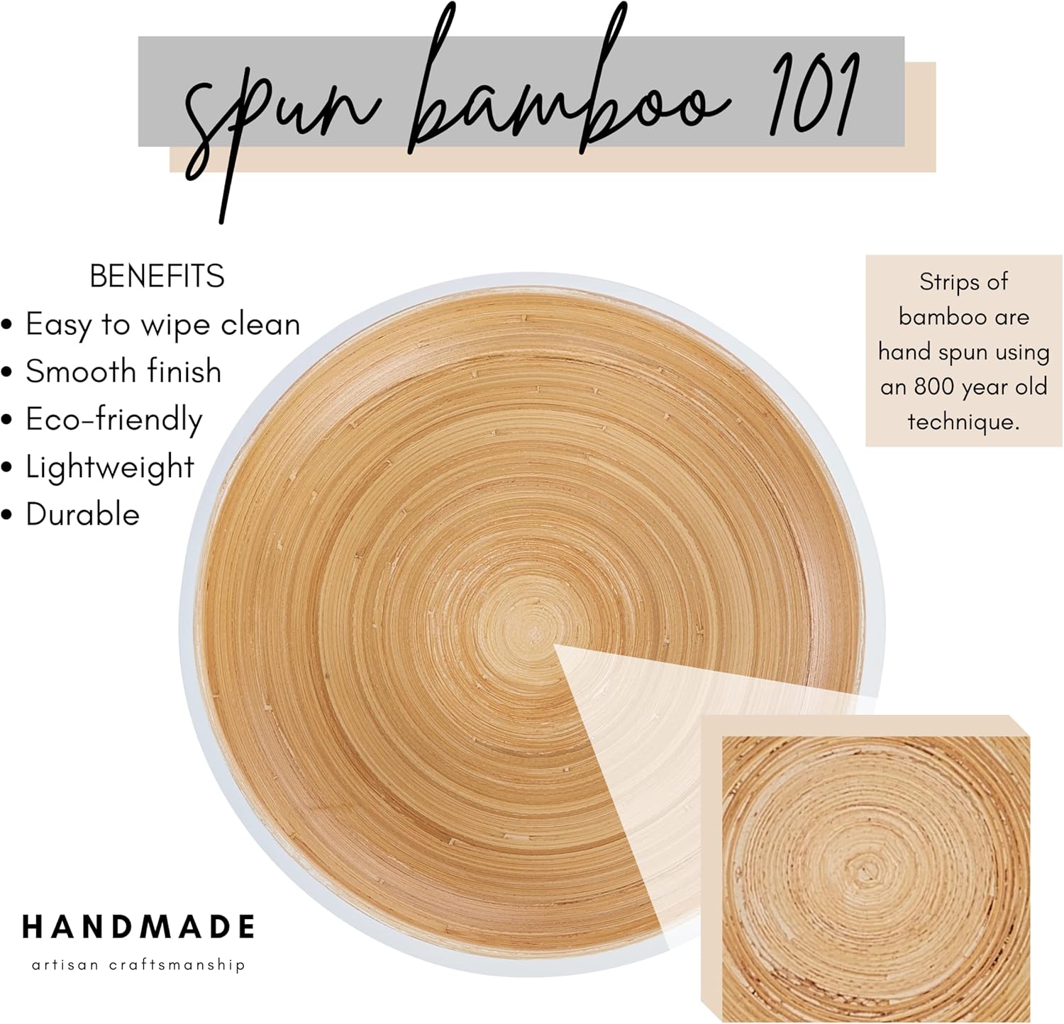 - Add the warmth of handmade, natural materials to your home while keeping a modern, sleek look and feel with this spun bamboo bowl, whether you need a fruit bowl for kitchen counter, decorative bowl for the living room, or centerpiece for the dining table.