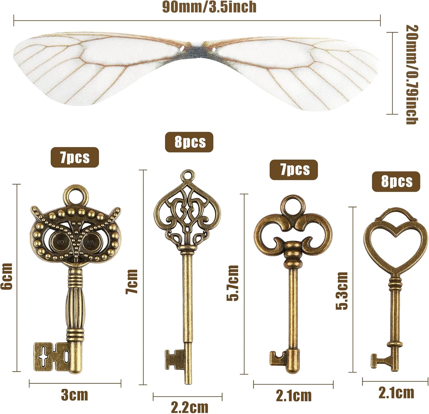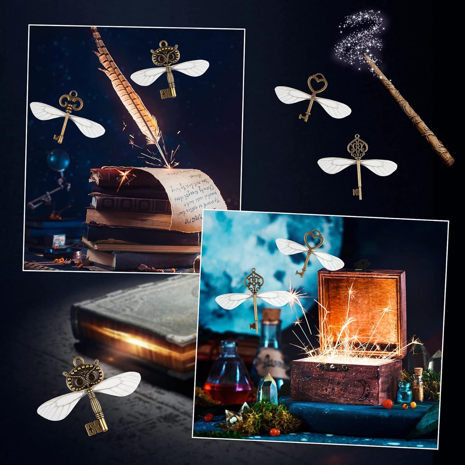 - Package: Magic themed flying keys DIY set includes 30 pieces vintage skeleton keys, 30 pairs white dragonfly wings,50 pieces clear double sided sticky dots and elastic crystal string(length about 30yd), enough quantity to use.