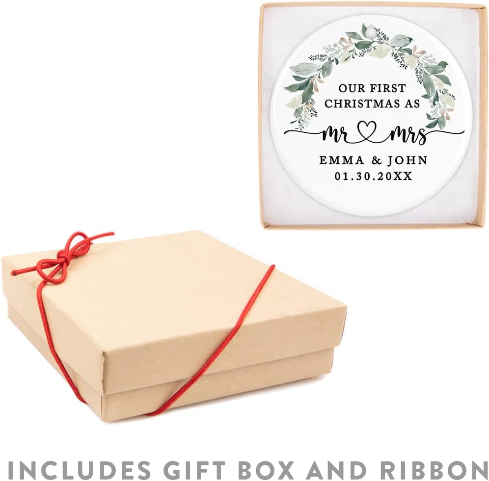 - Gift-Ready with Elegant Packaging: Whether itโs for you or as a thoughtful gift for newlywed friends or family, this custom christmas ornament comes beautifully packaged and ready for gift-giving. The included ribbon makes it easy to hang, adding a touch of elegance to any tree. It's ideal for wedding ornaments for bride and groom 2024.
