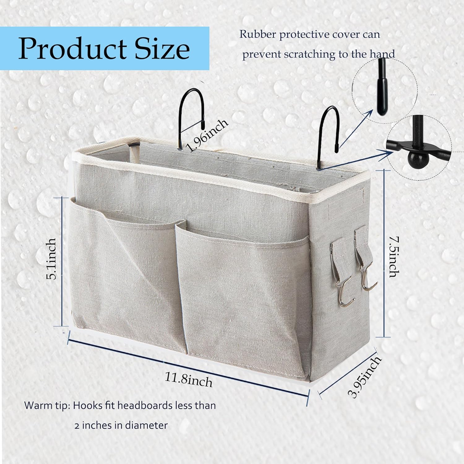 - ă Premium Material ăThe bedside caddy is made of Canvas and iron. make it strong and sturdy.The bedside storage caddy has 1 large pocket, 2 small pockets,1 small mesh pockets,and 2 hook up. You can storage your everything you want on bed, everything is well organized and within reach.