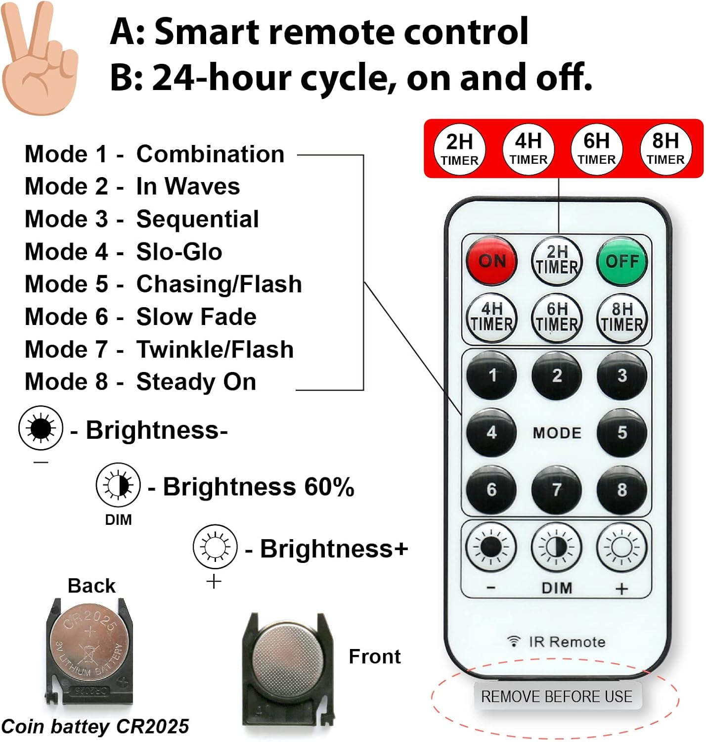 - 8 Mode and Timer and Levels Dimmable: 8 different flash modes to choose from, and you can adjust the brightness by pressing "dim-" Or Press "dim+"; That are all controlled easily with a wireless remote from a distance of 10 to 15 meters, aim at the USB receiving direction when you press; 6 hours On and 18 hours Off automatically every 24hrs once TIMER activated; Got more choices for your night