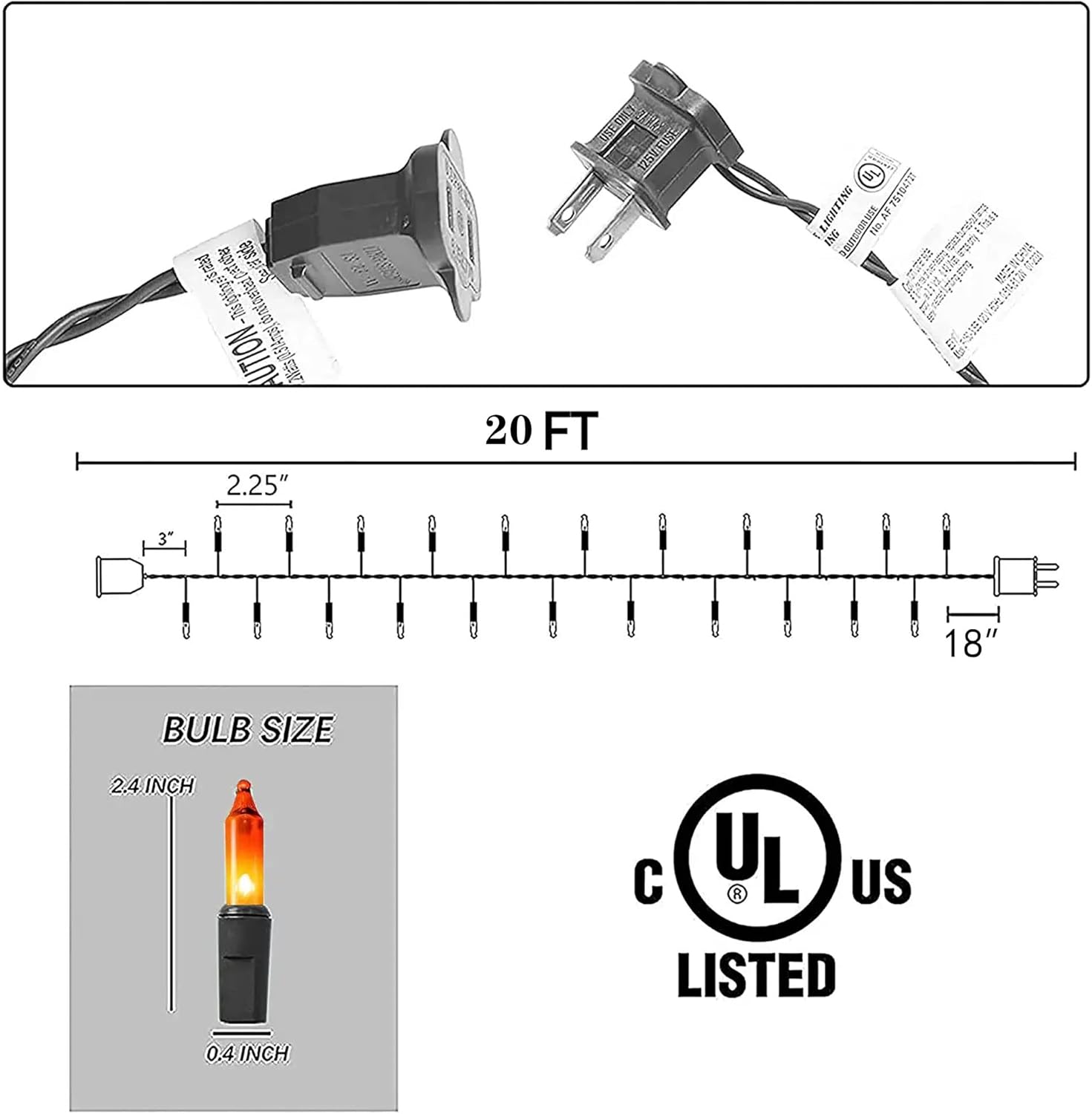 - Charming Halloween Lights: Package include 1 x 20ft mini string light, 1 x spare fuse, 4 spare incandescent bulbs. The lighted length of Halloween clear string light is 18.5 ft, the leading wire is 1.5 ft, and the bulb space is 2.25 inch, work voltage of each bulb is 2.5V / 0.42W, safety with built in 3A fuse.