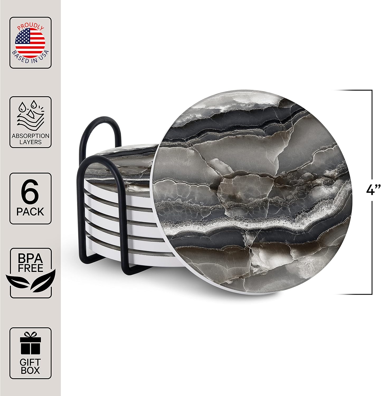 - ✅ LARGE SIZE – Our special material ceramic makes the coasters great for drinking beverage glasses, cups and mugs. Giftable idea for family, friends, women and men. Our wide selection includes black, grey, white, gold, brown, funny, mid century pattern, geometric, geode, rustic, minimalist and industrial style. Protects surfaces and absorbs faster than sandstone, soapstone, tile, cork, silicone, quartz, porcelain or marble.