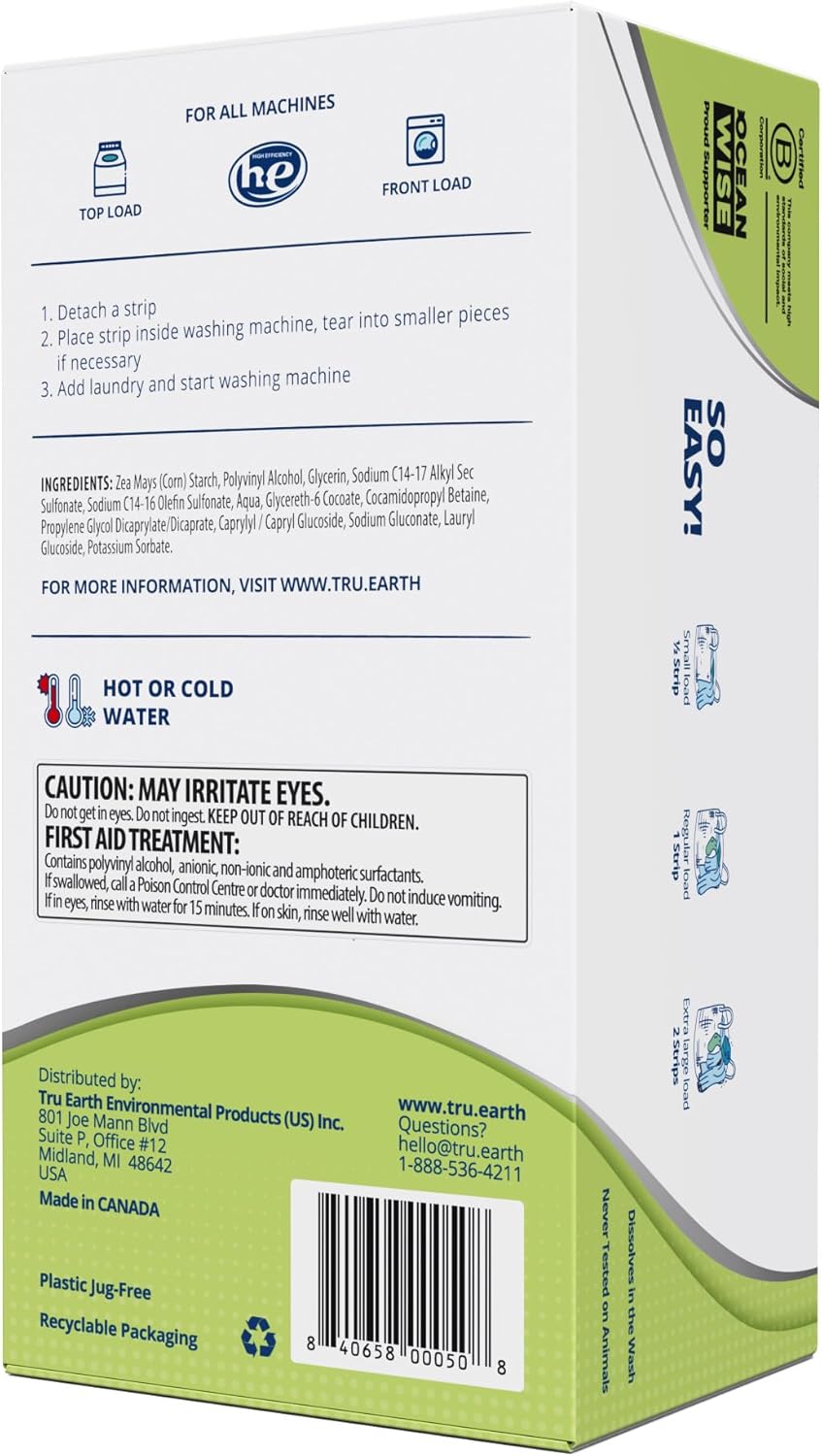 - NO MEASURING, NO MESS: Letโs face it. Traditional liquid laundry detergent can sometimes be messy, and takes up space. Measuring out detergent whether it is liquid or powder can result in spillage. With Tru Earth sheet laundry detergent, 1 strip equals 1 load - no measuring and nothing to spill.