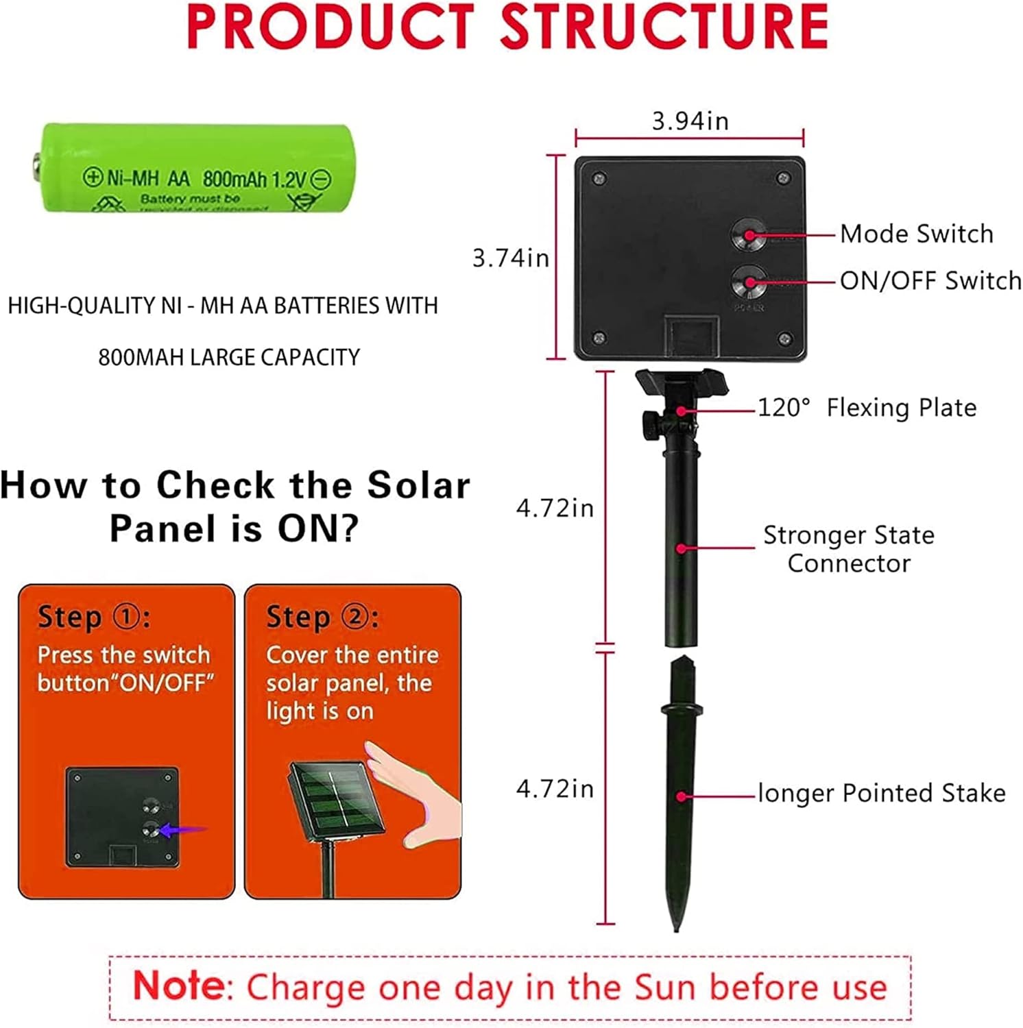- Solar Powered Garden Lights: Powered by solar, it can work for 10 to 12 hrs after fully charged (The charging efficiency depends on the weather). Each solar panel is equipped with Ni-MH AA 800m AH battery, which has large capacity for whole night lighting require. Please turn on switch at the back of solar panel before charging and the lights will be auto on at night, auto-off during the daytime.