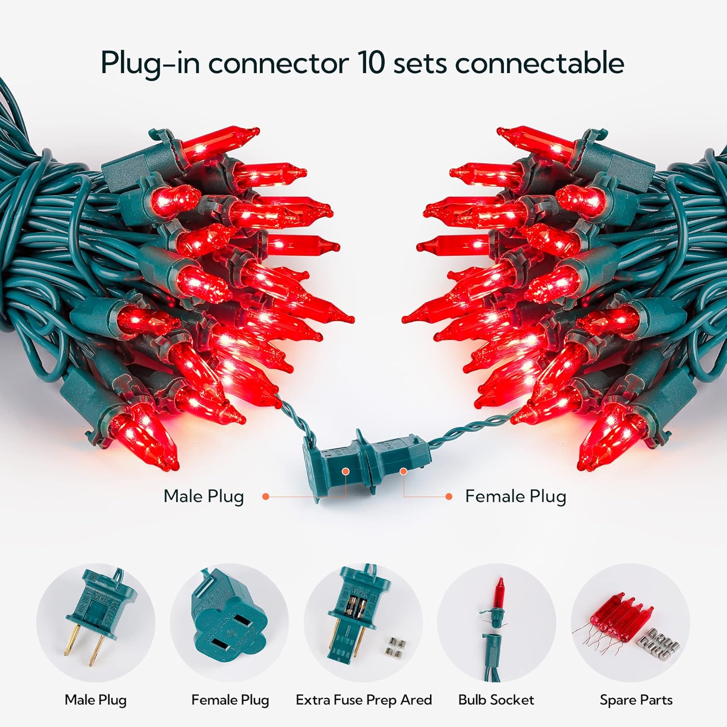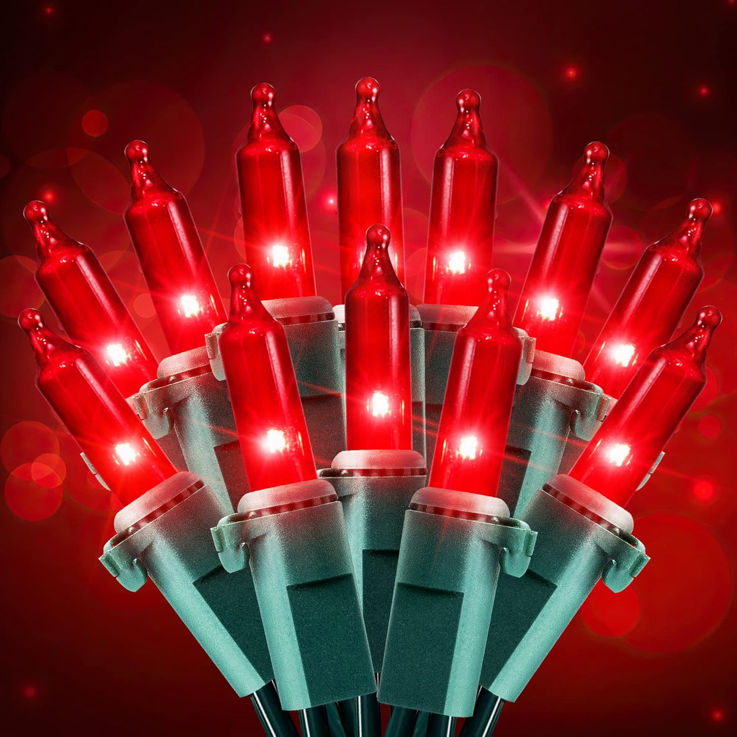 - 💕2Pack Incandescent Christmas Lights:Hopolon 2 PACK 50L Red Christmas mini lights is 13ft in total-Green wire with Bulbs: 3.5m/11.5ft, cord without lights50cm/1.5ft, spacing between every bulb: 7cm/2.76in. With Thicker green wire with strong insulated copper core, tangle-free to use,High quality UL certified products ensure the safety of you and your family.
