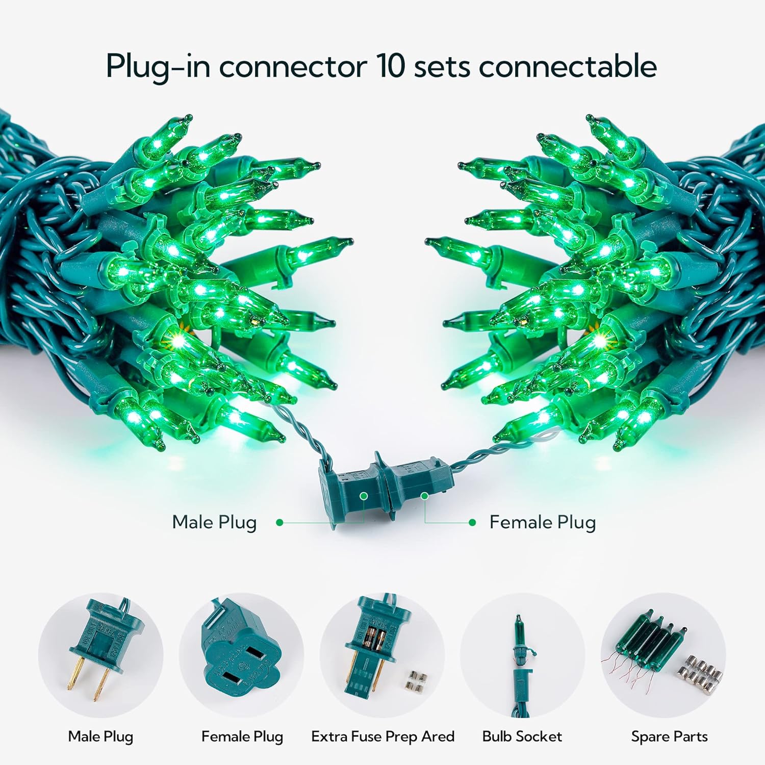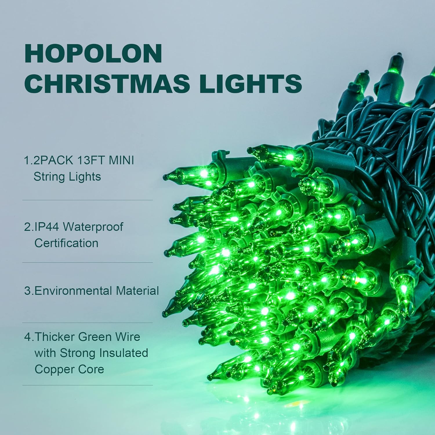 - ๐2Pack Incandescent Christmas Lights:Hopolon 2 PACK 50L Green Christmas mini lights is 13ft in total-Green wire with Bulbs: 3.5m/11.5ft, cord without lights50cm/1.5ft, spacing between every bulb: 7cm/2.76in. With Thicker green wire with strong insulated copper core, tangle-free to use,High quality UL certified products ensure the safety of you and your family.