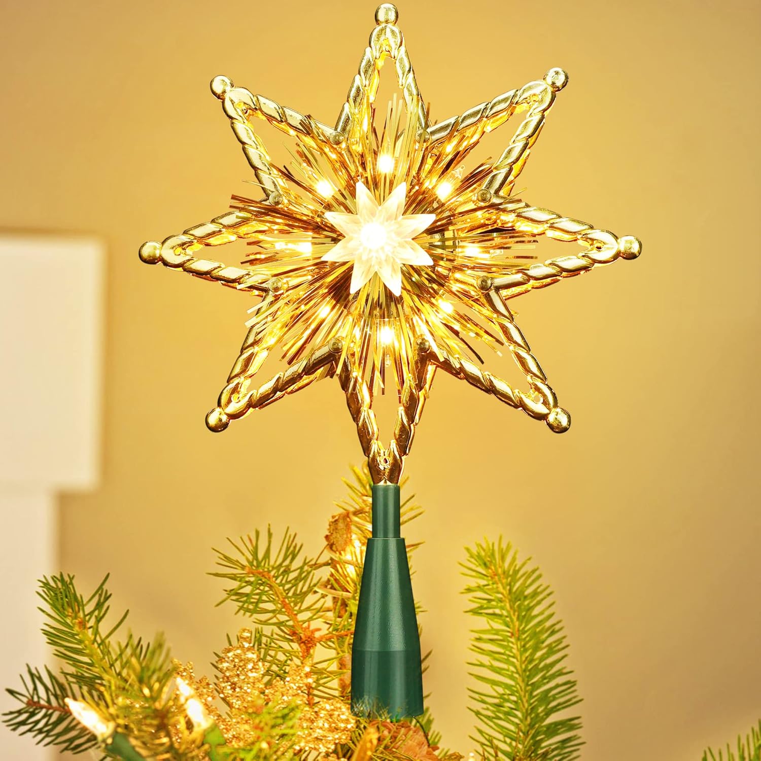 ODEETRONIC Christmas Star Tree Topper, 8 in 120V UL Certified Double Sided 8-Point Star Christmas Treetop Lights, Indoor Lighted Xmas Treetop for Bedroom Home Party Wedding Decor, Gold, Warm White