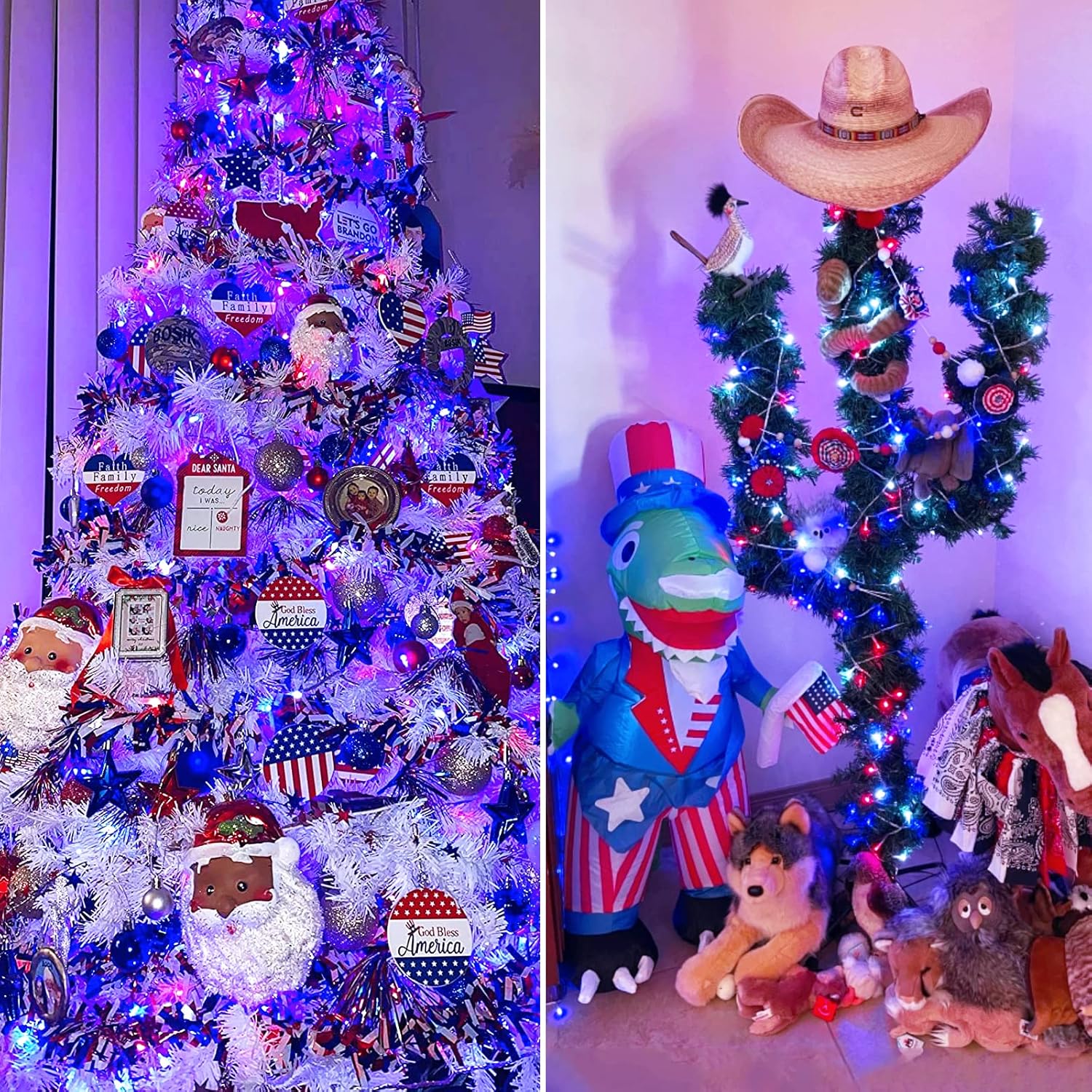 - ăIndoor & Outdoor Patriotic LightsăThese patriotic lights are suitable when you decided to completely switch your Christmas tree theme, these lights are working like a champ! When you wrap them around a wreath, Christmas tree, or bush, the clear wire design blends perfectly with the background, fill your home with a patriotic atmosphere. Besides, our patriotic Lights are perfect for decorating gardens, porches, patios, bedrooms, and other places at 4th of July decor.