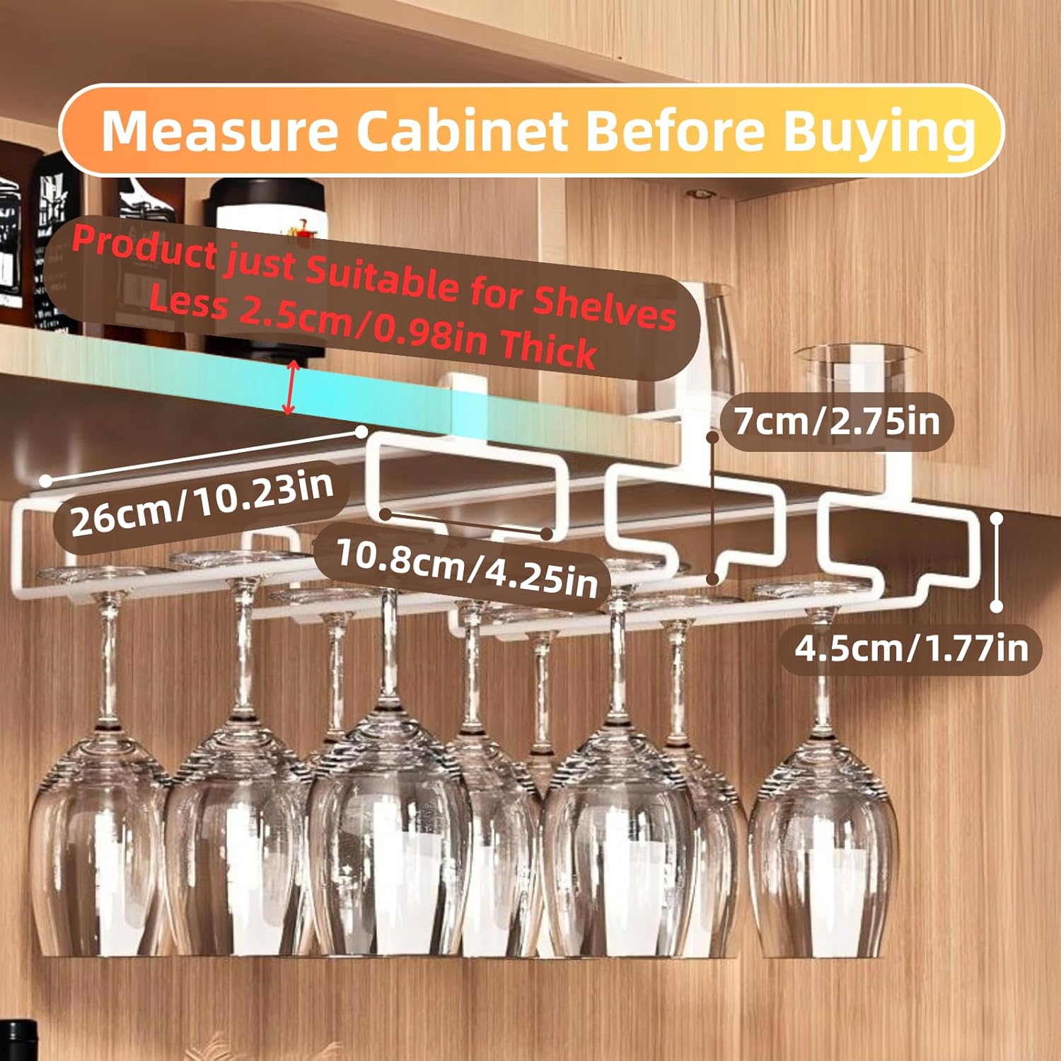 - Space Saving & Easy Access:this under-cabinet wire glass hanging storage rack ensures you have more space inside the kitchen cabinet,partition board, wine cabinet,and it makes your wine glasses well displayed and easy access.Suitable for any shelves with 1inch thickness or less.Please Measure The Thickness Of The Board Of The Shelf Or Cabinet Before Purchase