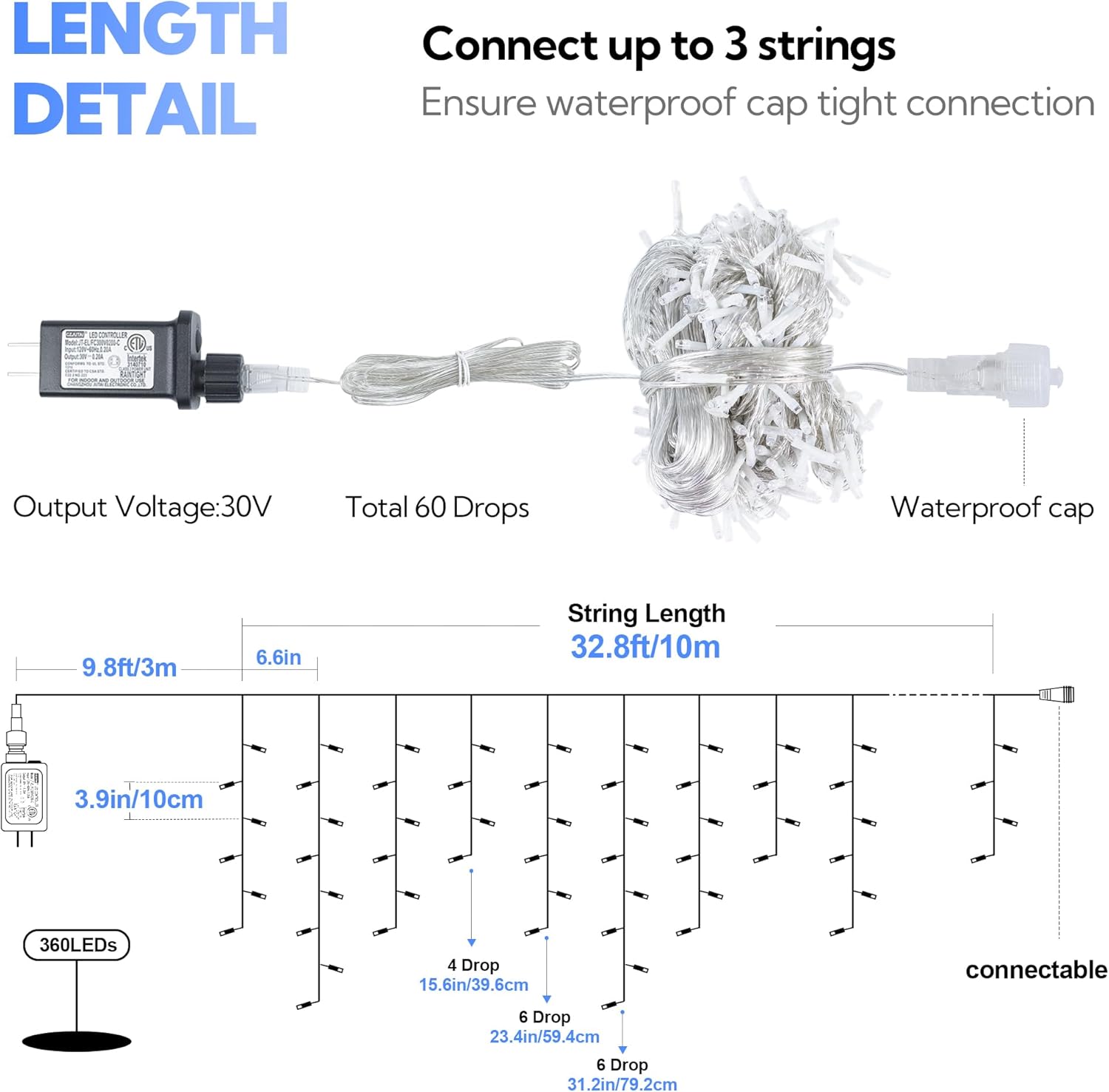 - 💗【Connectable for Wide Use】: Our icicle Christmas lights adopt 360L bright led bulbs,42.6ft/ 13m long in total with total 60 drops.Drop lengths 16''- 24''- 31''- 24'', number of light bulbs is 4, 6, 8, and 6 respectively. The outdoor string lights is extendable,can maximum connect with 3 sets.clear wire looks simple but dreamy.You can hang them on roof, hedge, fence, prom, patio, eave, handrail etc, creating romantic atmosphere for wedding,party,Valentine's Day,Christmas,New Year.