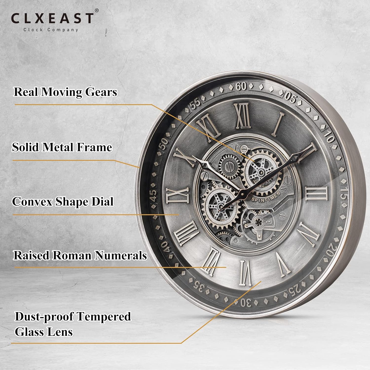 CLXEAST 24 Inch Large Moving Gear Wall Clock for Living Room Decor, Antique Silver Metal Roman Numerals Wall Clocks for Home Office