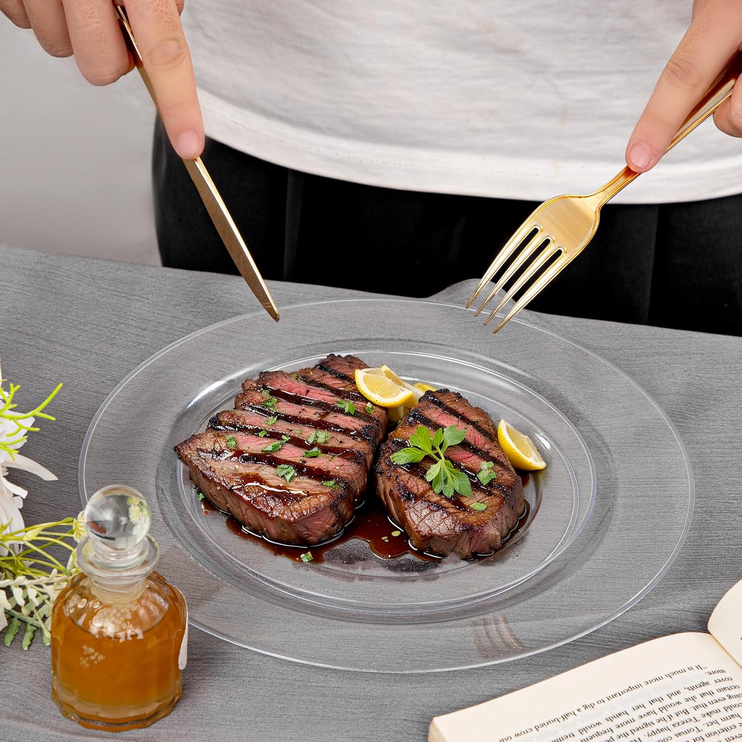 - REUSABLE: Our clear dessert plates and clear dinner plates are unpatterned and unprinted. Wash them with water after use and they will look like new. So, if you're diligent enough, you can wash these clear disposable plates and then dry them for multiple uses.