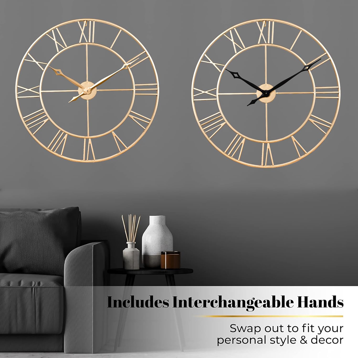 - [Easy to Read and Hang]-30" (75cm) Oversized large Roman numerals in contrast with aluminum large hands for easily reading. Simple design with a good performance. Package Comes with 1 set extra color interchangeable Clock Handsďźalso included Invisible Nail Hangers for hanging