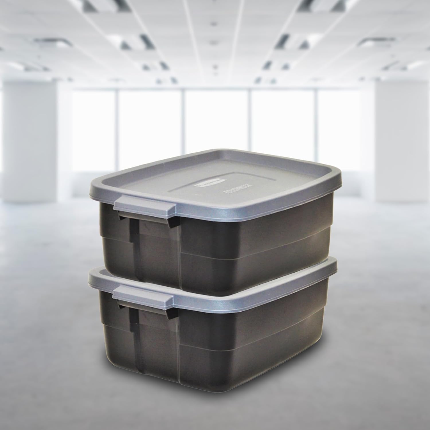 Rubbermaid Roughneck Tote 10 Gal, 6 Pack, Made in USA, Black & Gray, Rugged Plastic Stackable Storage Bins with Lids and Handles
