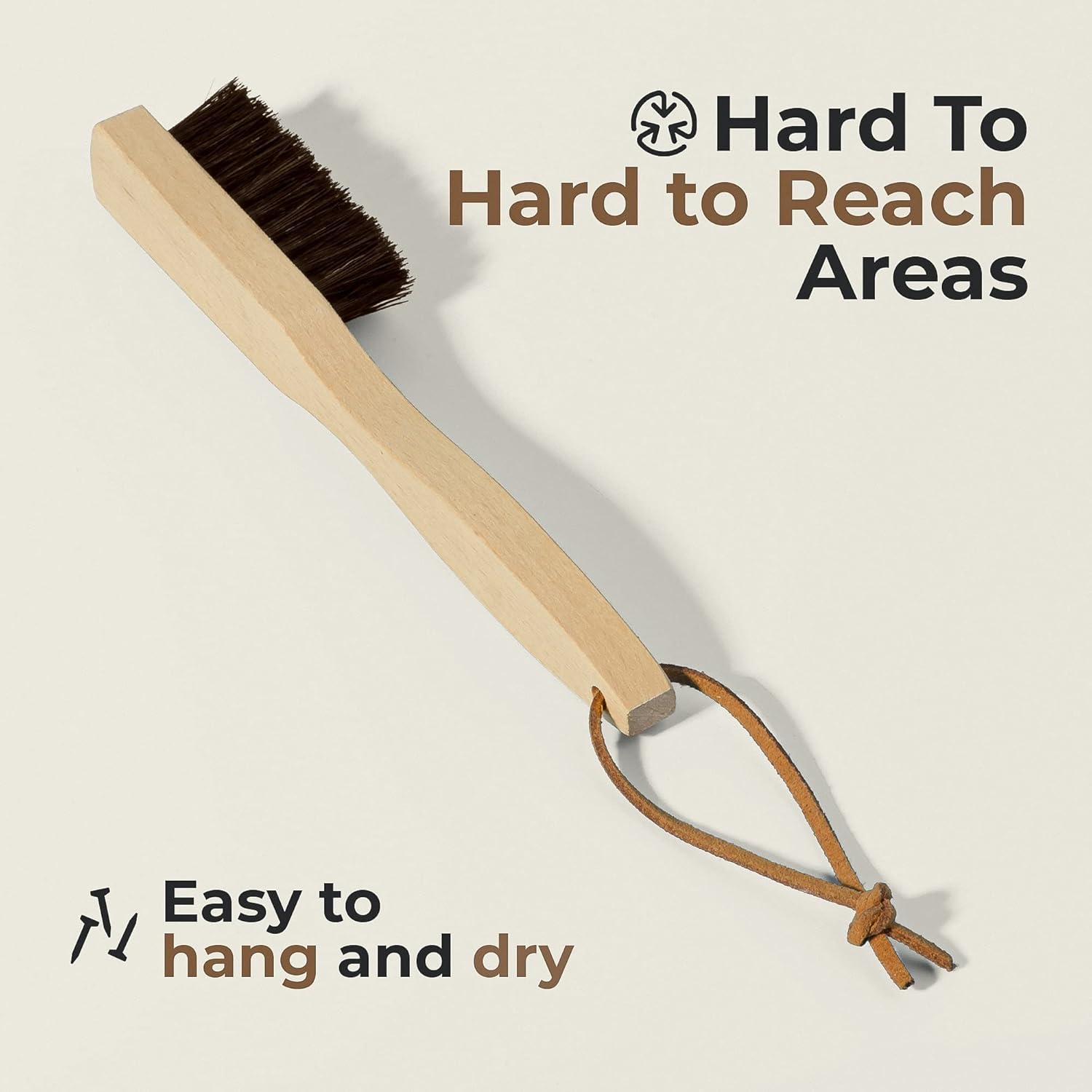 - β Remove Stains From Your Favorite Leather Items: Apply some stain solution on your couch, car seat, shoes, purse, or jacket, work into the leather with our stain removal brush and make stubborn oil, grass, or mud stains history. Hang the brush from the leather loop and let it dry before the next use.