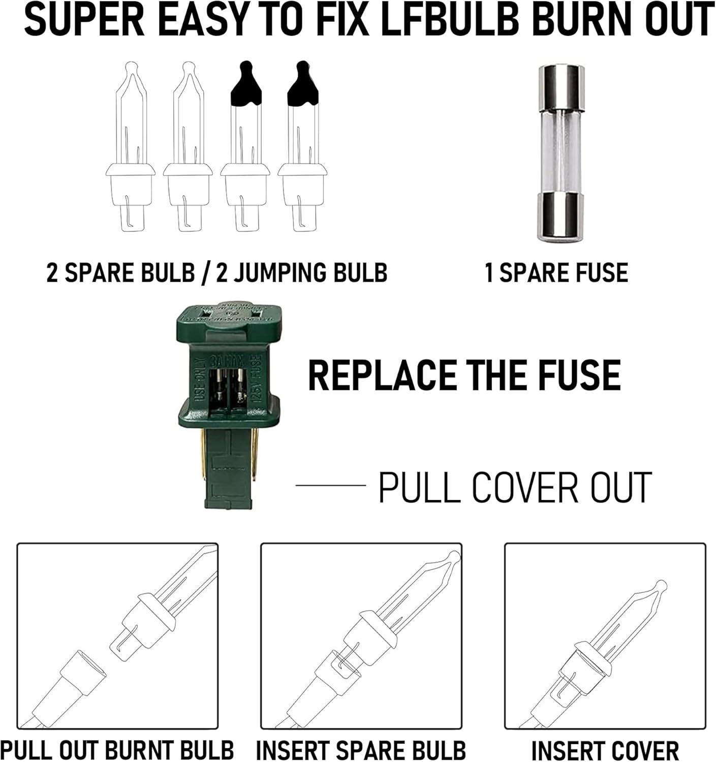 - Lights Size: The Christmas mini string lights includes 100 count incandescent light bulbs, the total length is 20 ft, the length of string light is 18.5 ft, lead wire is 1.5 ft, spacing between each light is 2.25 inches. The string light built-in 3A fuse and it is 120V high voltage with UL Certificated for safety, ensure the safety of you and your family. Package Includes: 1 x 20 ft light string, 1 x spare fuse, 2 x replacement incandescent bulbs, 2 x flasher bulbs.