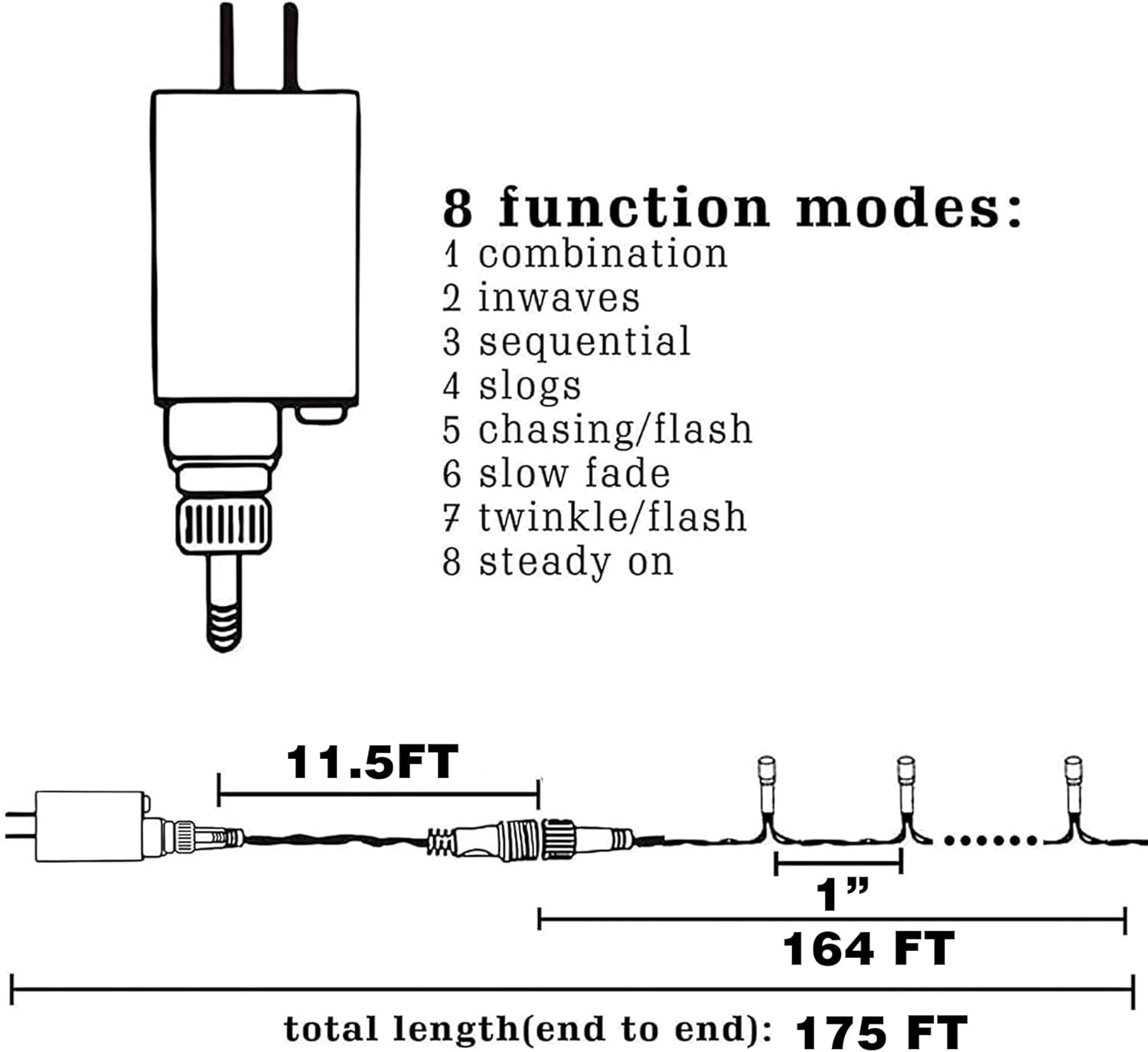- Light Specifications: With 2000 LED lights, each Christmas string lights is 175.5 ft long in total, wire with LED bulbs is 164 ft, lead cord without lights is 11.5 ft, spacing between per LED bulb is 1 inch. Waterproof design allows it to be used indoors and outdoors. NOTE: this LED string lights could not be extended or connected together.