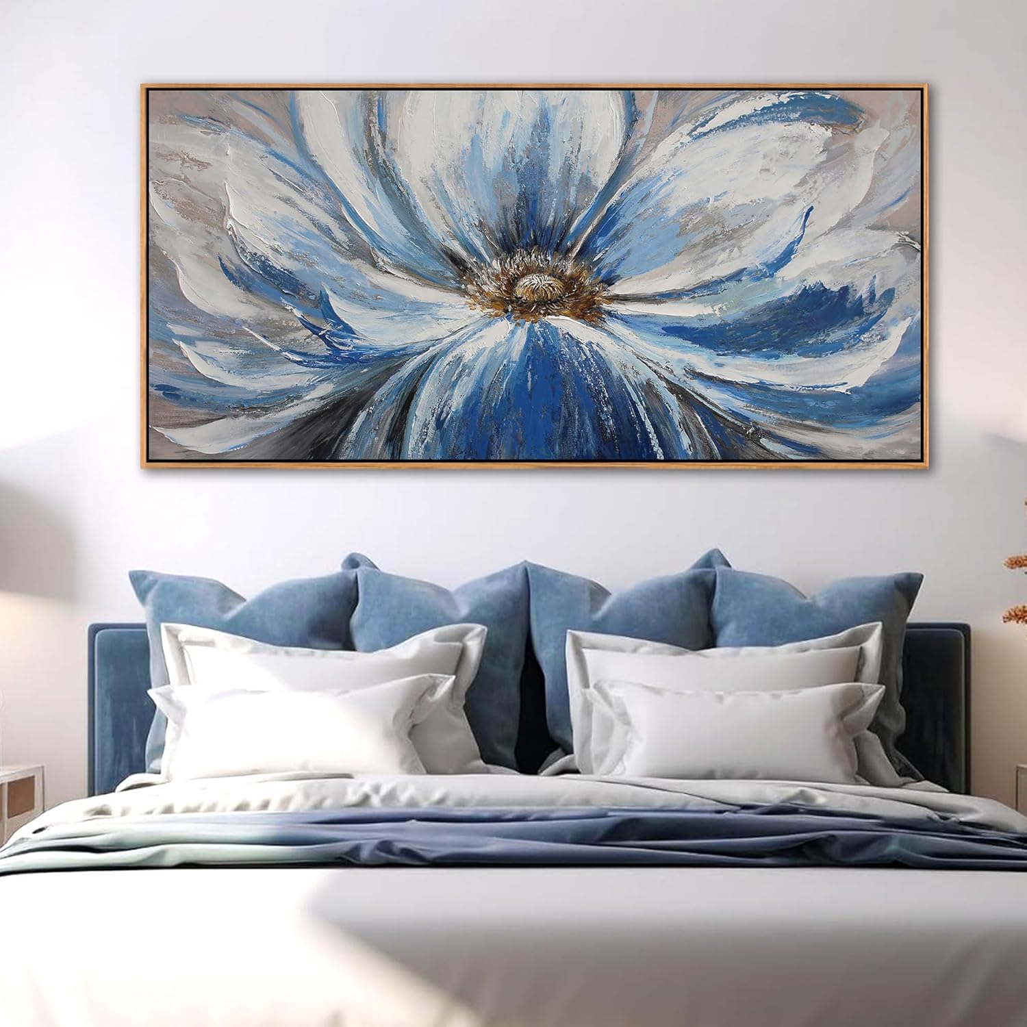 Blue Wall Art for Living Room Large White Flower Picture Wall Decor Canvas Art Wall Artwork Pictures for Bedroom Wall Decor Size 24x48(With Soild Wood Dark Framed)