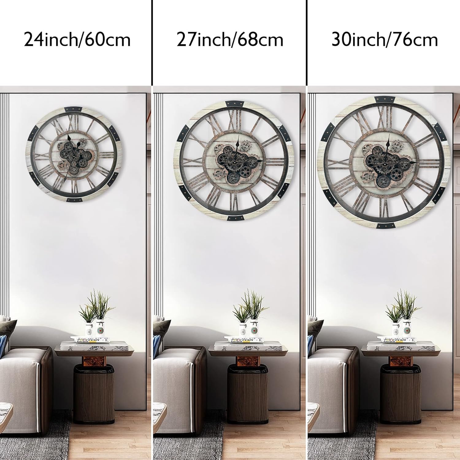 DORBOKER 24" Large Wall Clock with Moving Gears,Oversize Vintage Industrial Rustic Farmhouse Clocks for Living Room Decor Office Home,Solid Wood Retro Metal HD Tempered Glass Cover,Desert Beige