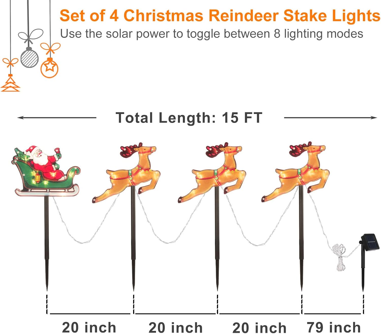 - Christmas Decor Dimension: 15 feet Christmas pathway lights set features 4 star stakes. The lead wire from the battery box to the first train is 6.5 ft, spacing between each star is 20 inch. Sled with Santa: 8.3β x 6.1β, Reindeer: 10β x 6.7β